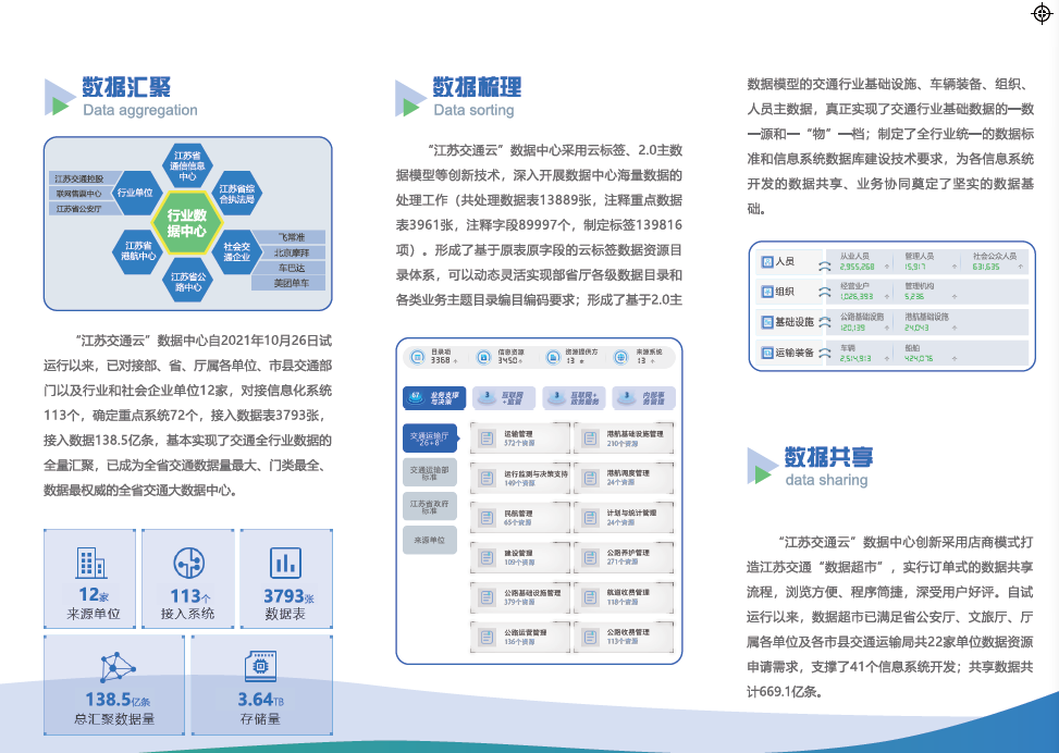 江苏省交通运输数据资源系统(“江苏交通云”数据中心)是江苏“十三五”交通运输信息化重点工程。作为江苏交通运输信息化规划的8大基础平台之一,该系统旨在打造全省交通行业统一的数据汇聚、数据共享和大数据应用平台,是实施全省交通运输信息资源交换共享的统一平台,也是全省交通运输信息资源对外交换的统一出口。