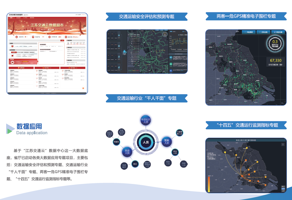 “江苏交通云”数据中心目前已支撑了大量的数据专题开发应用,主要包括:交通主数据专题、GPS数据专题、交通运行监测指标专题、疫情防控专题、安全监管与服务专题等。