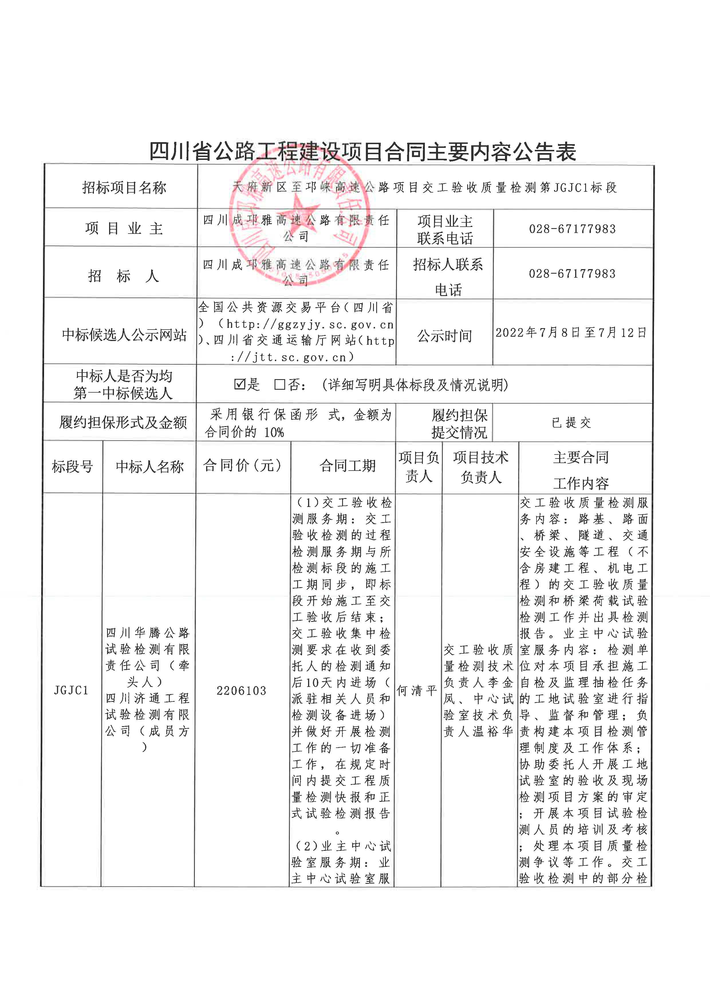天邛高速公路交工验收质量检测JGJC1标段合同主要内容公告