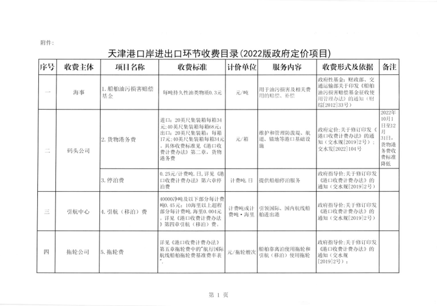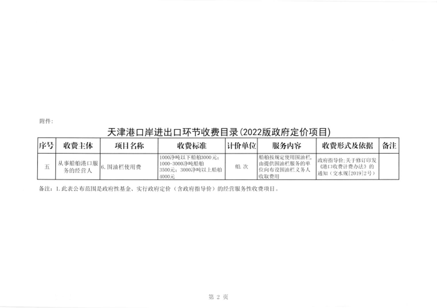 天津港口岸进出口环节收费目录(2022版政府定价项目)