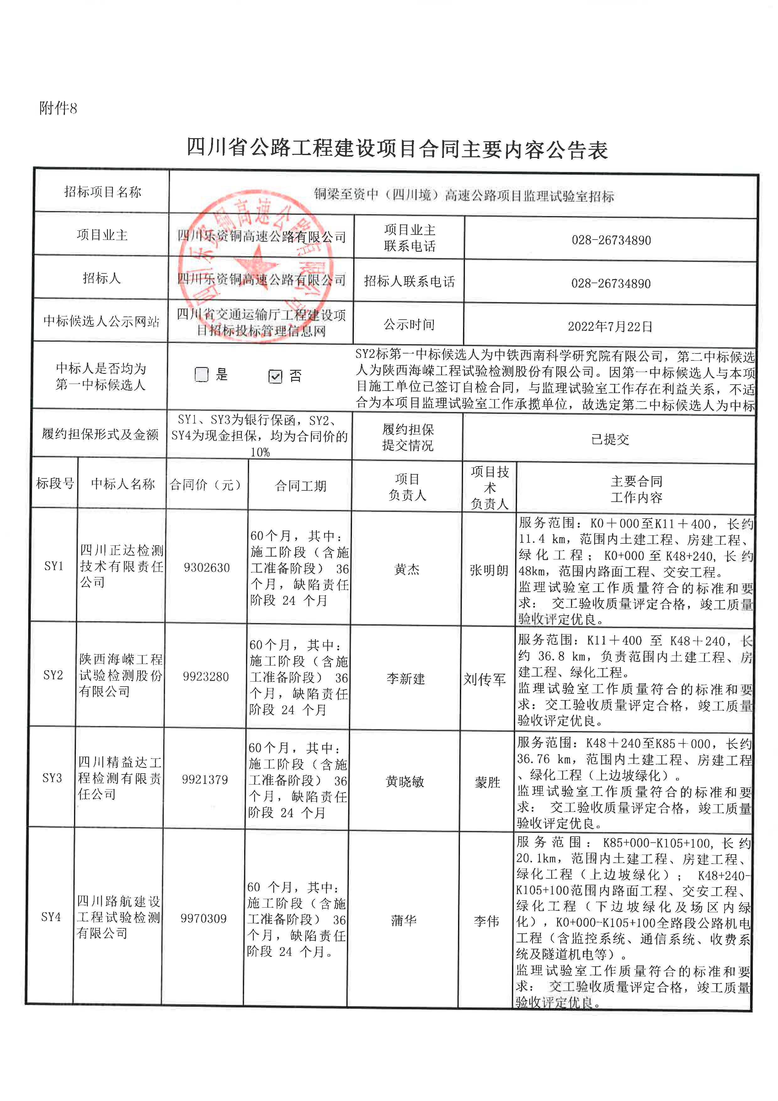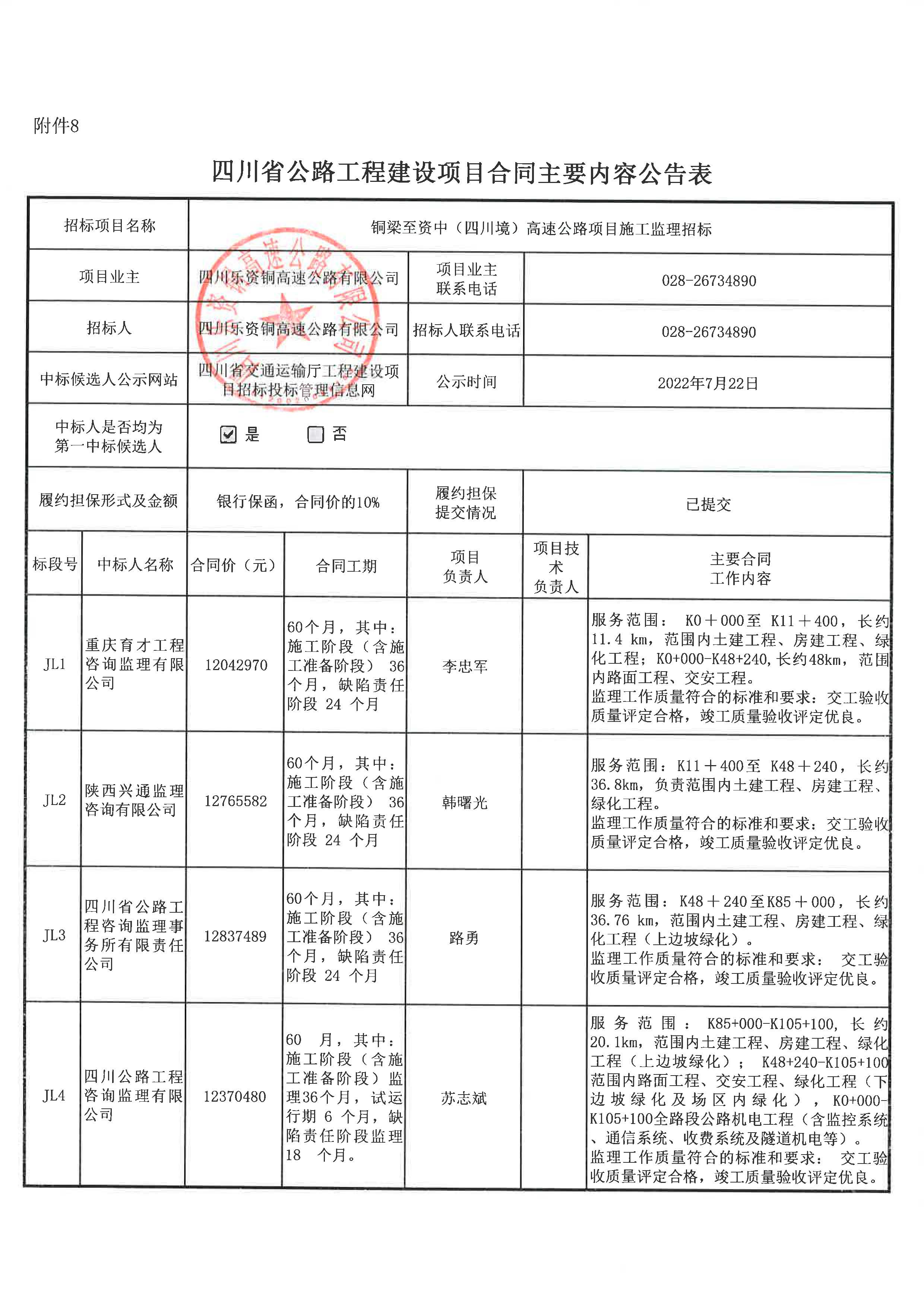 铜梁至资中(四川境)高速公路项目施工监理及监理试验室招标合同主要内容公告表