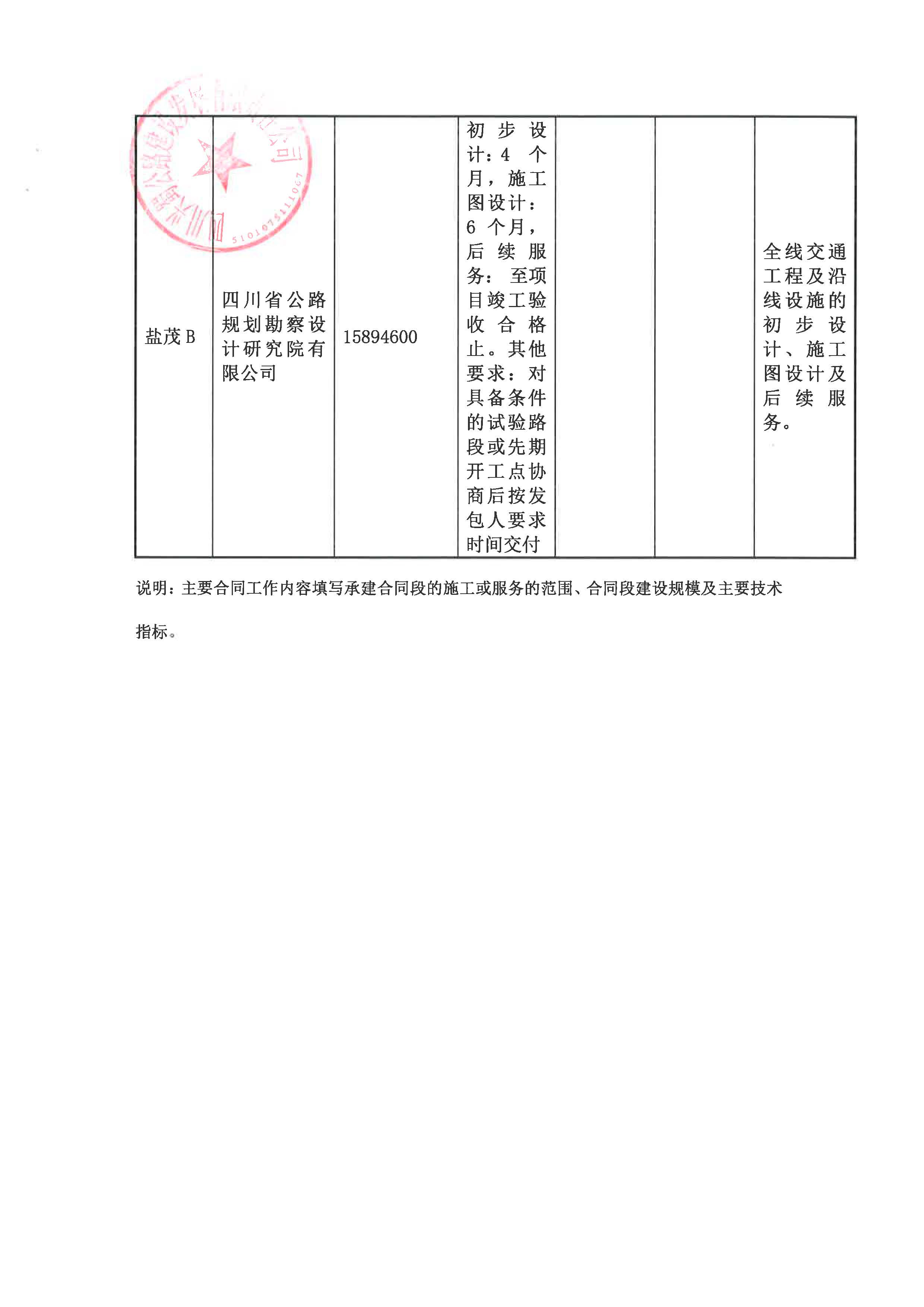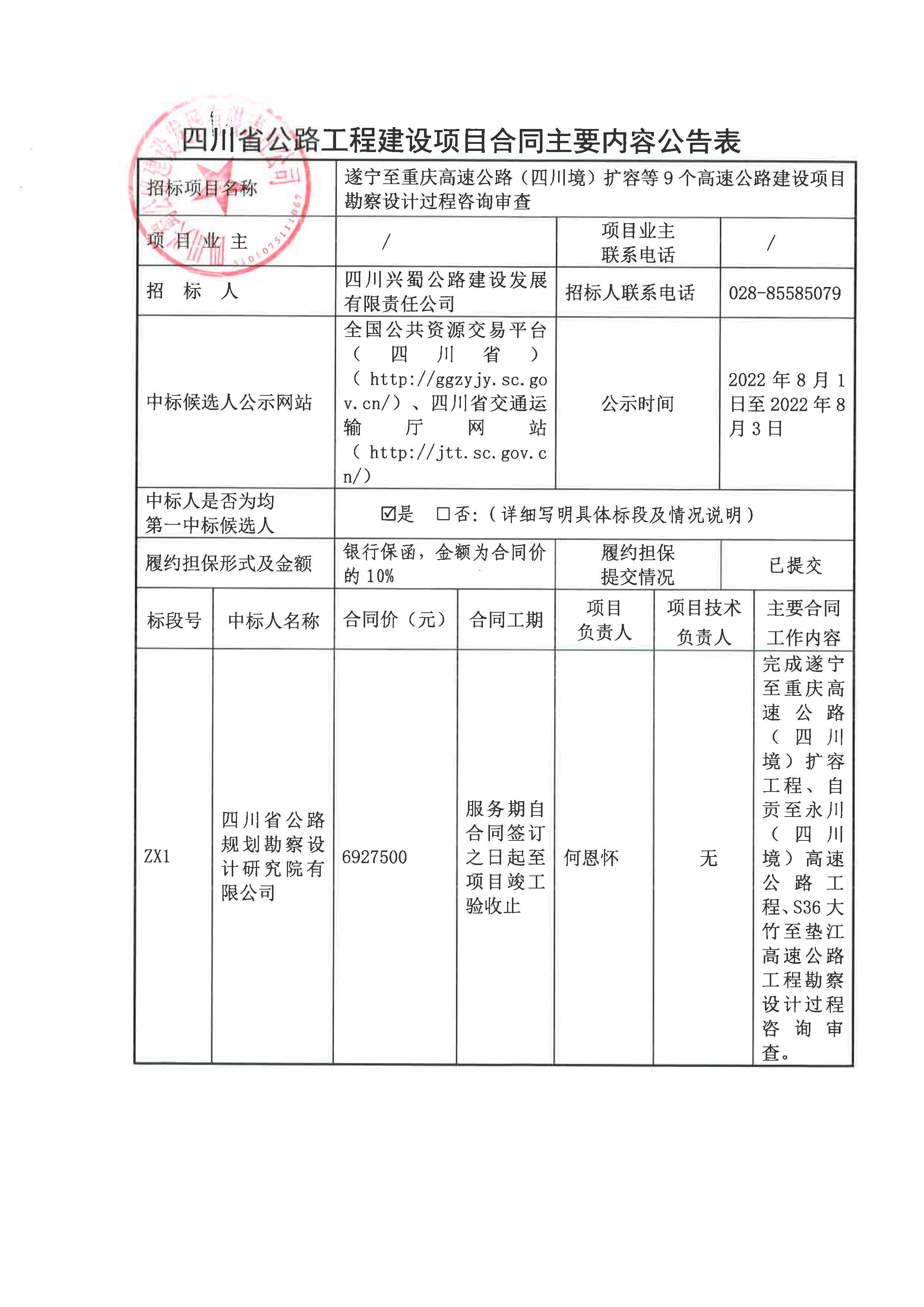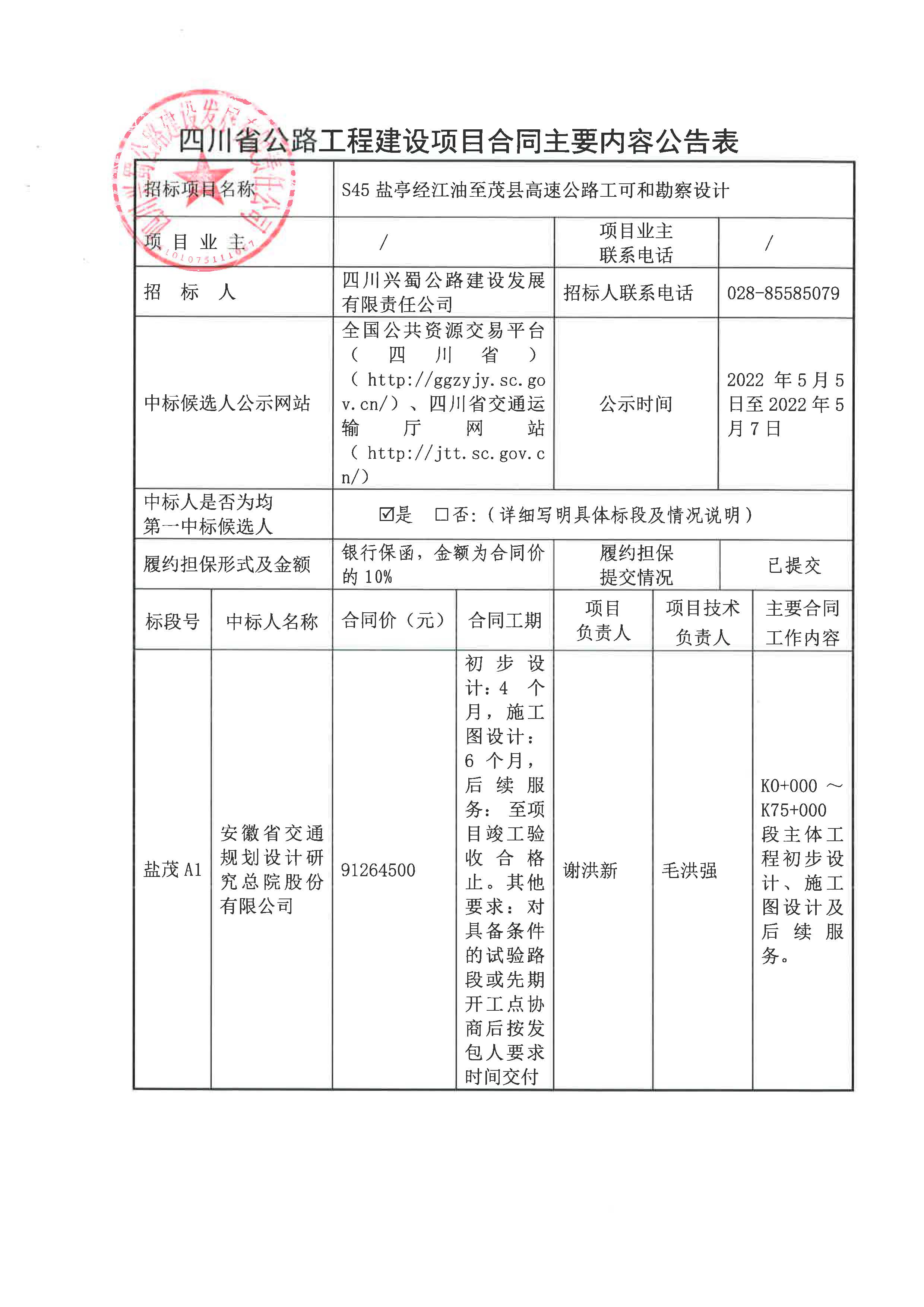 S45盐亭至茂县、遂宁至重庆扩容等高速公路勘察设计、过程咨询审查合同主要内容公告表