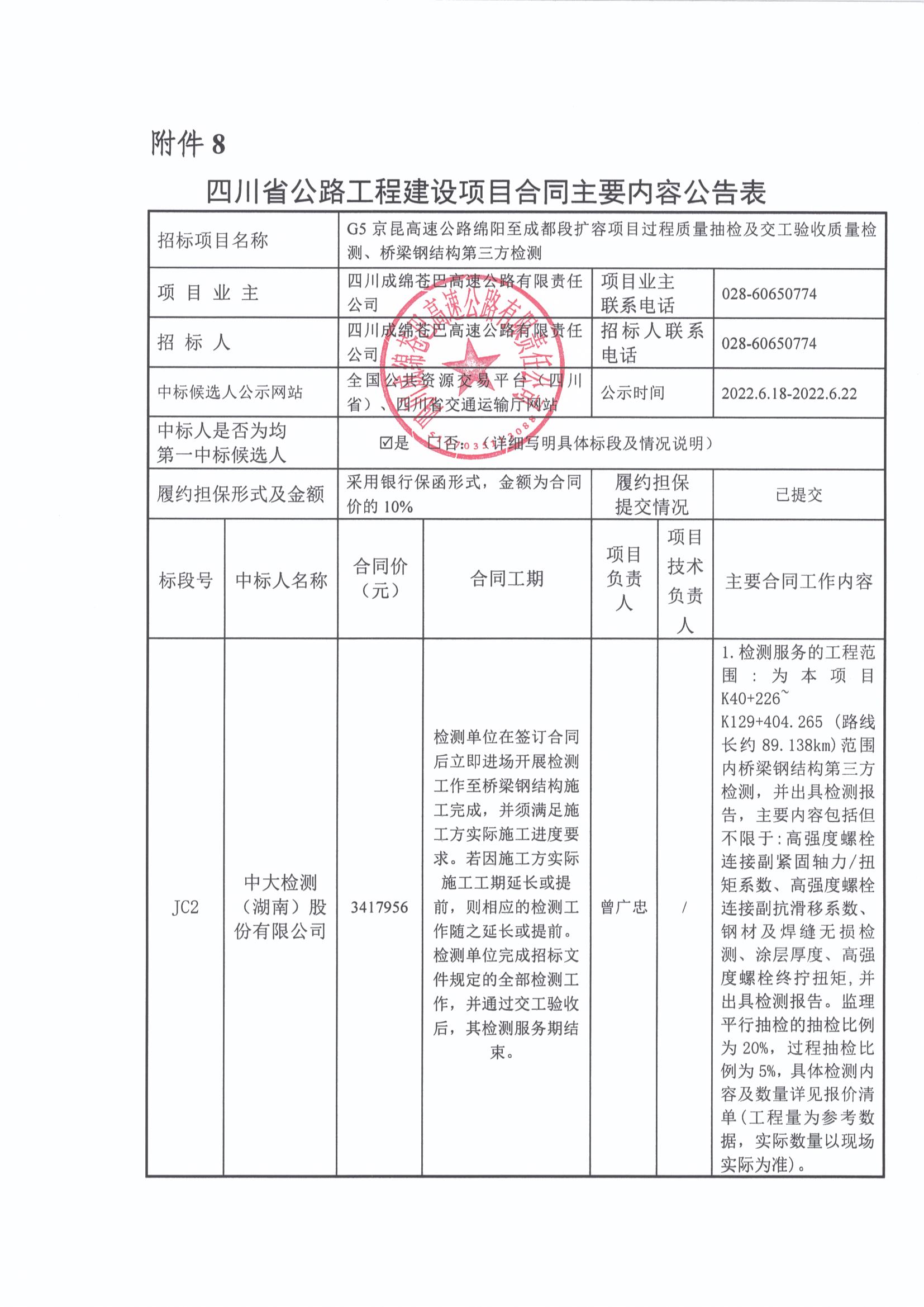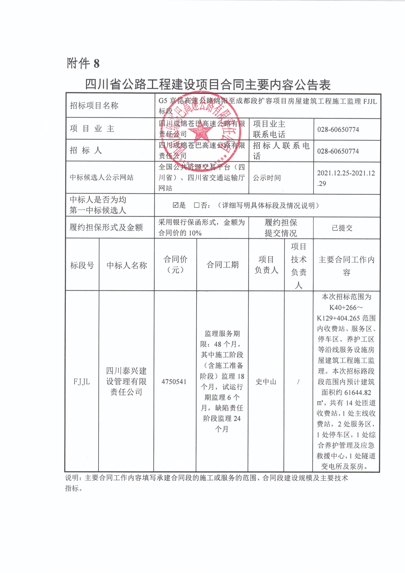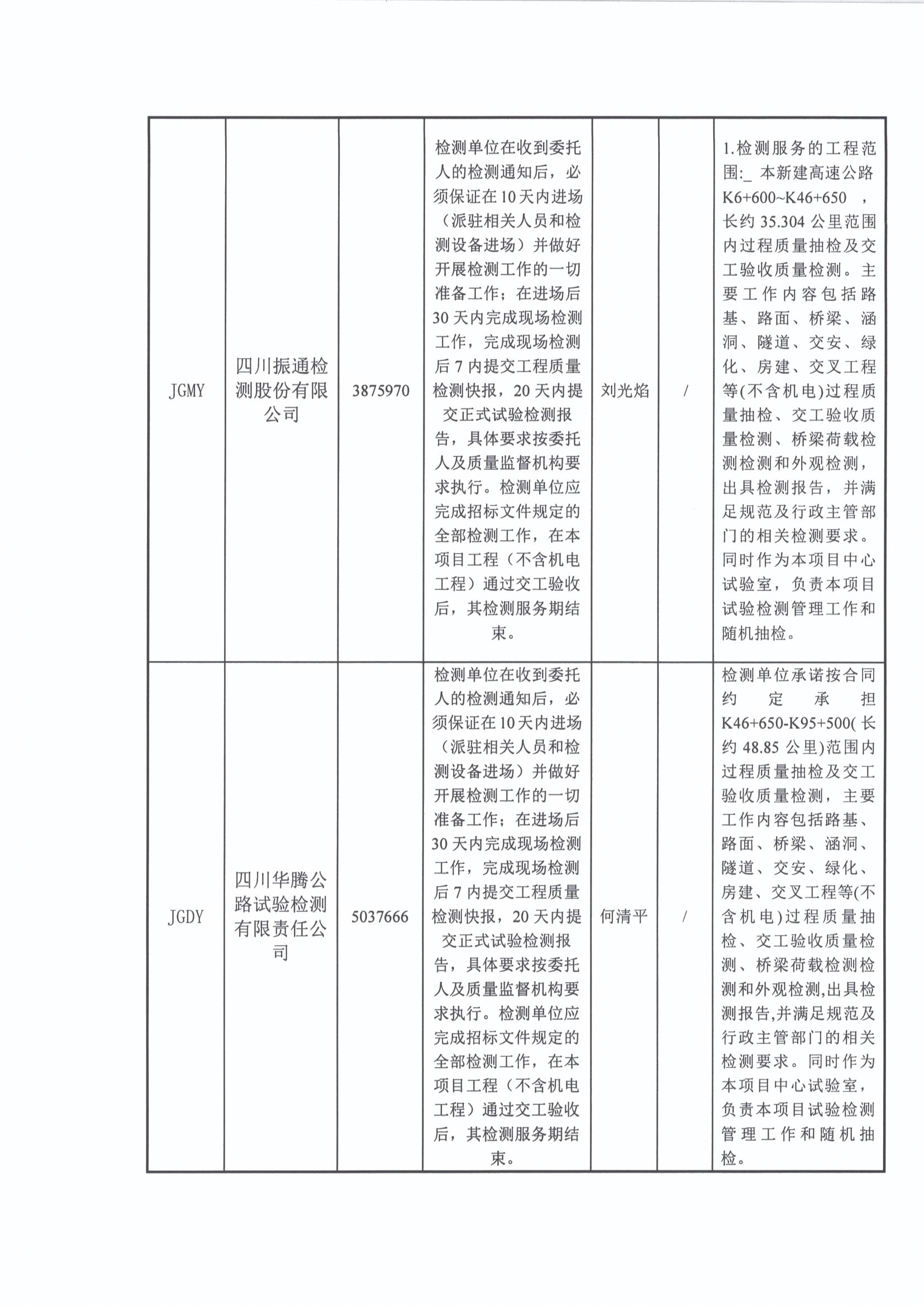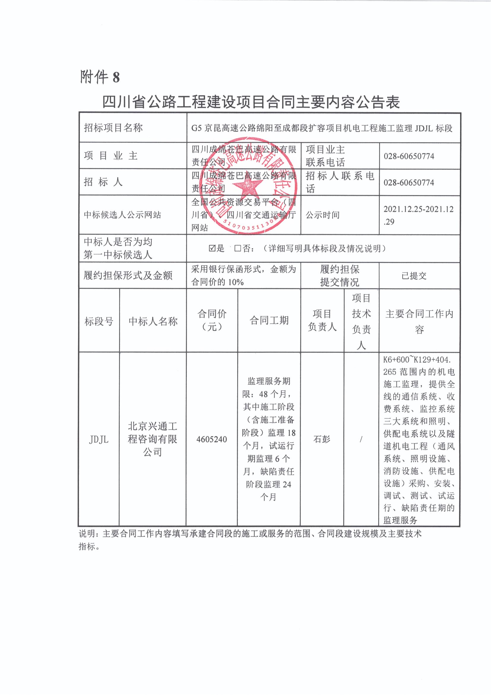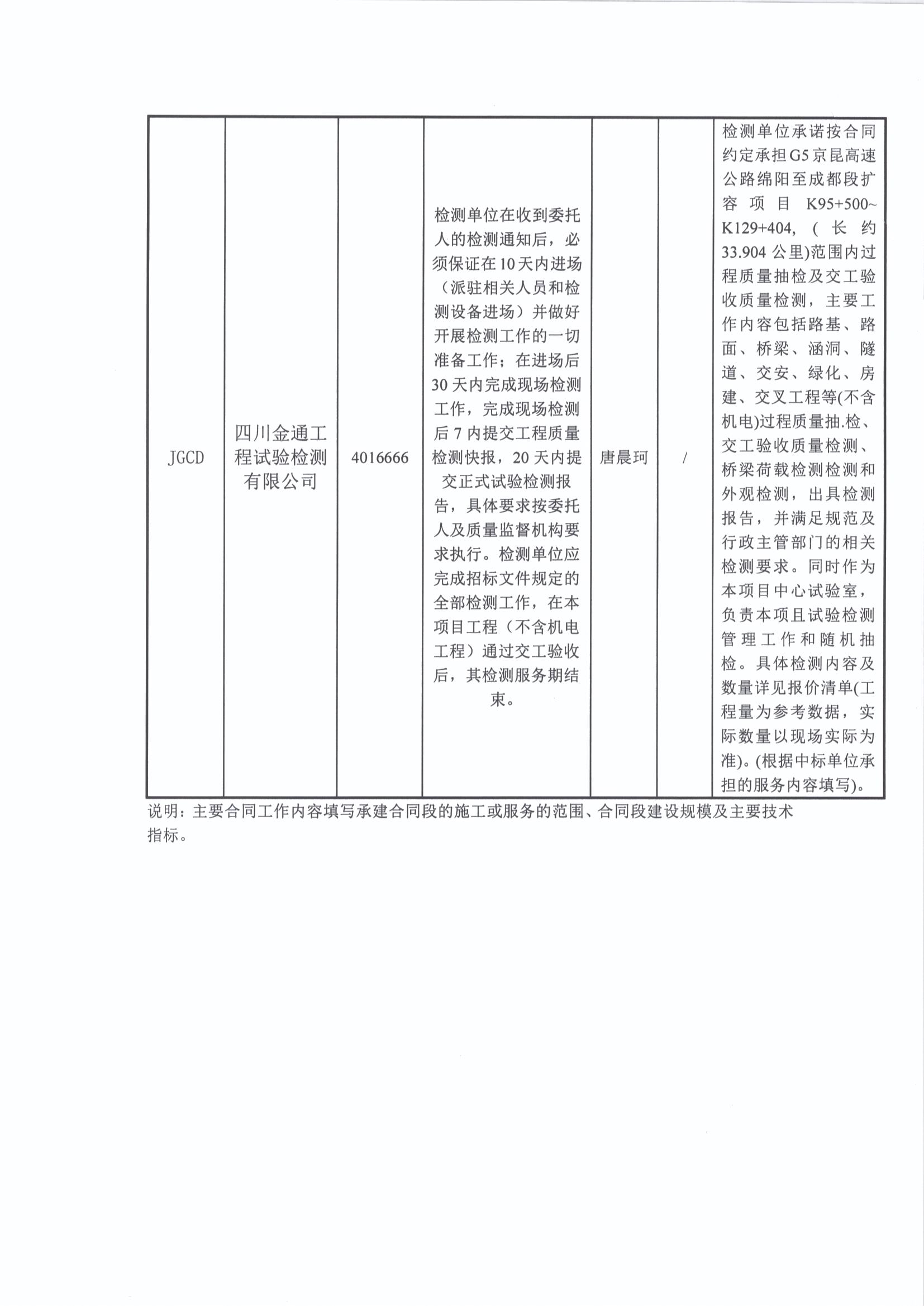 G5京昆高速成绵扩容项目房建监理、机电监理及过程质量检测合同主要内容公告表
