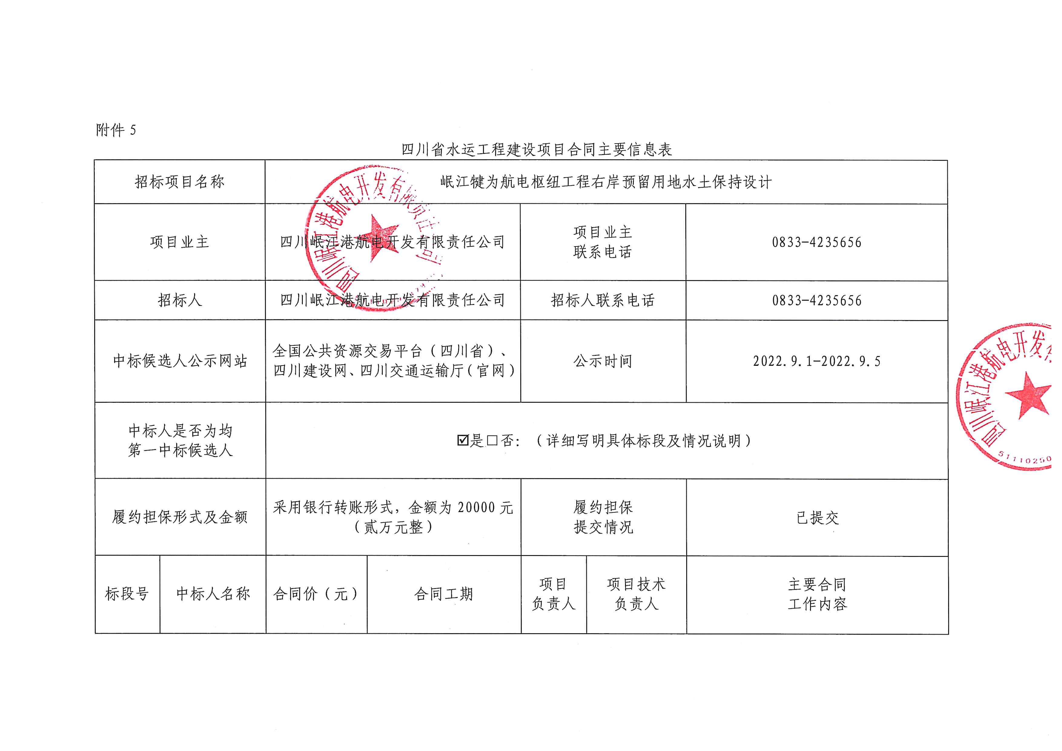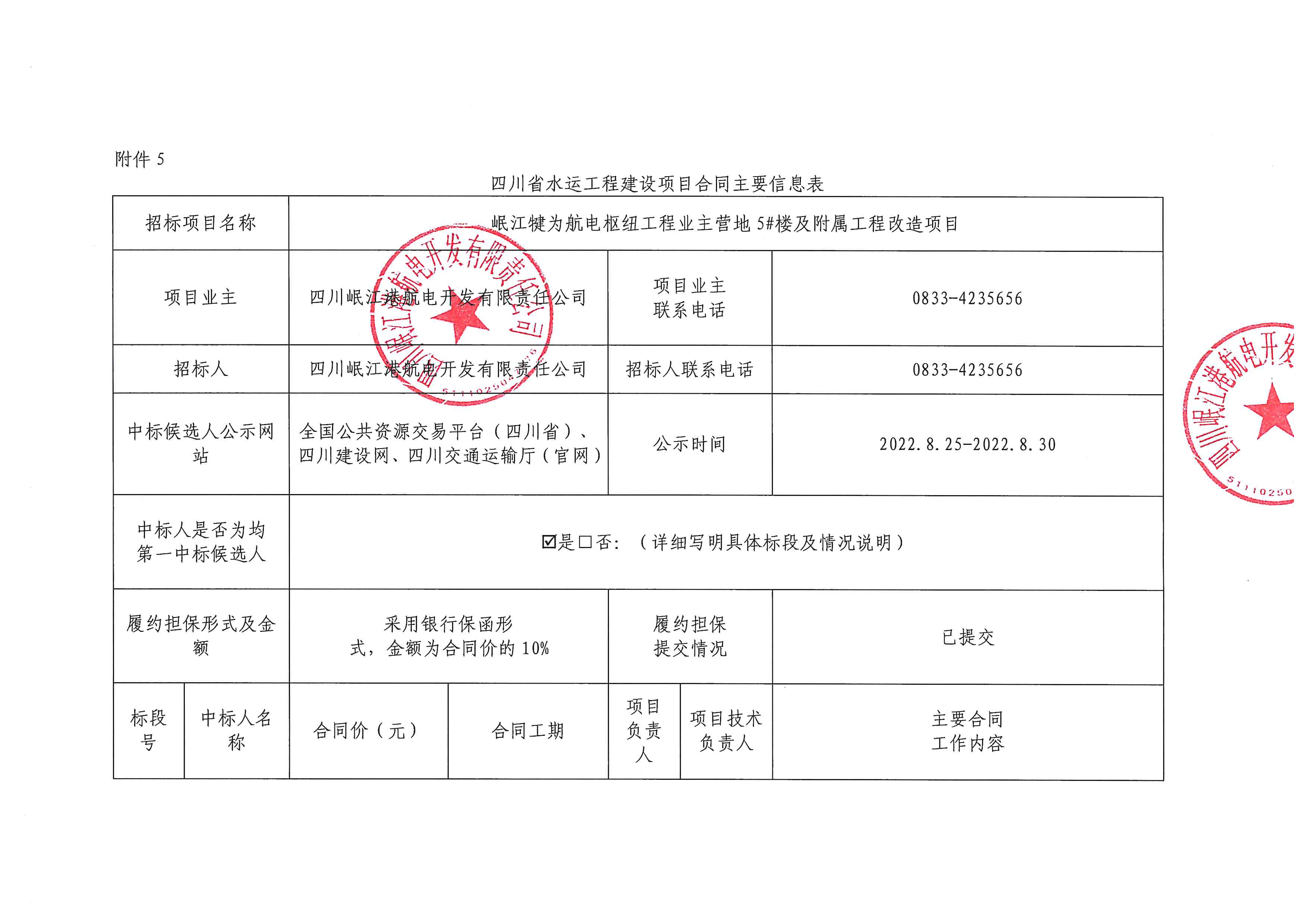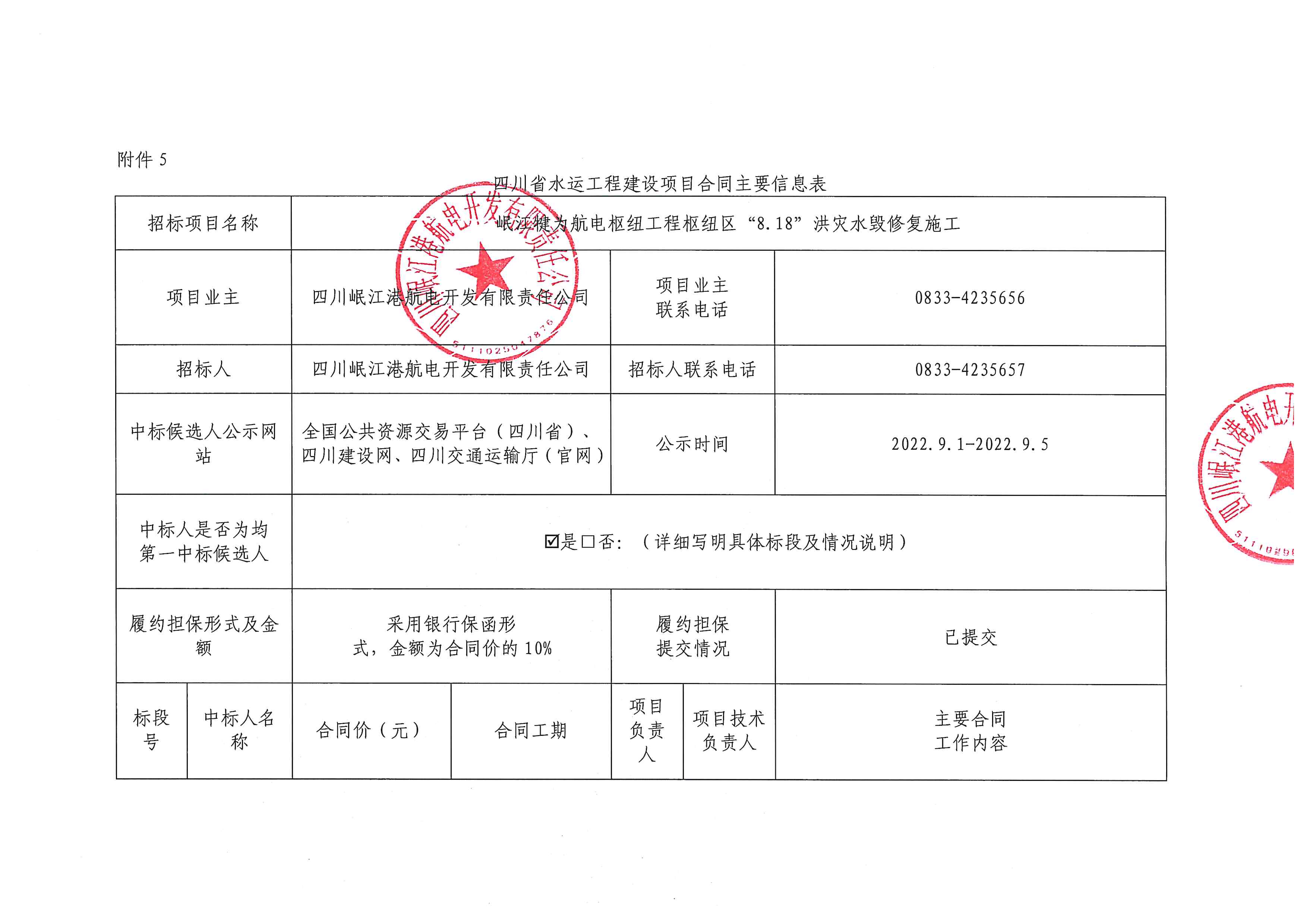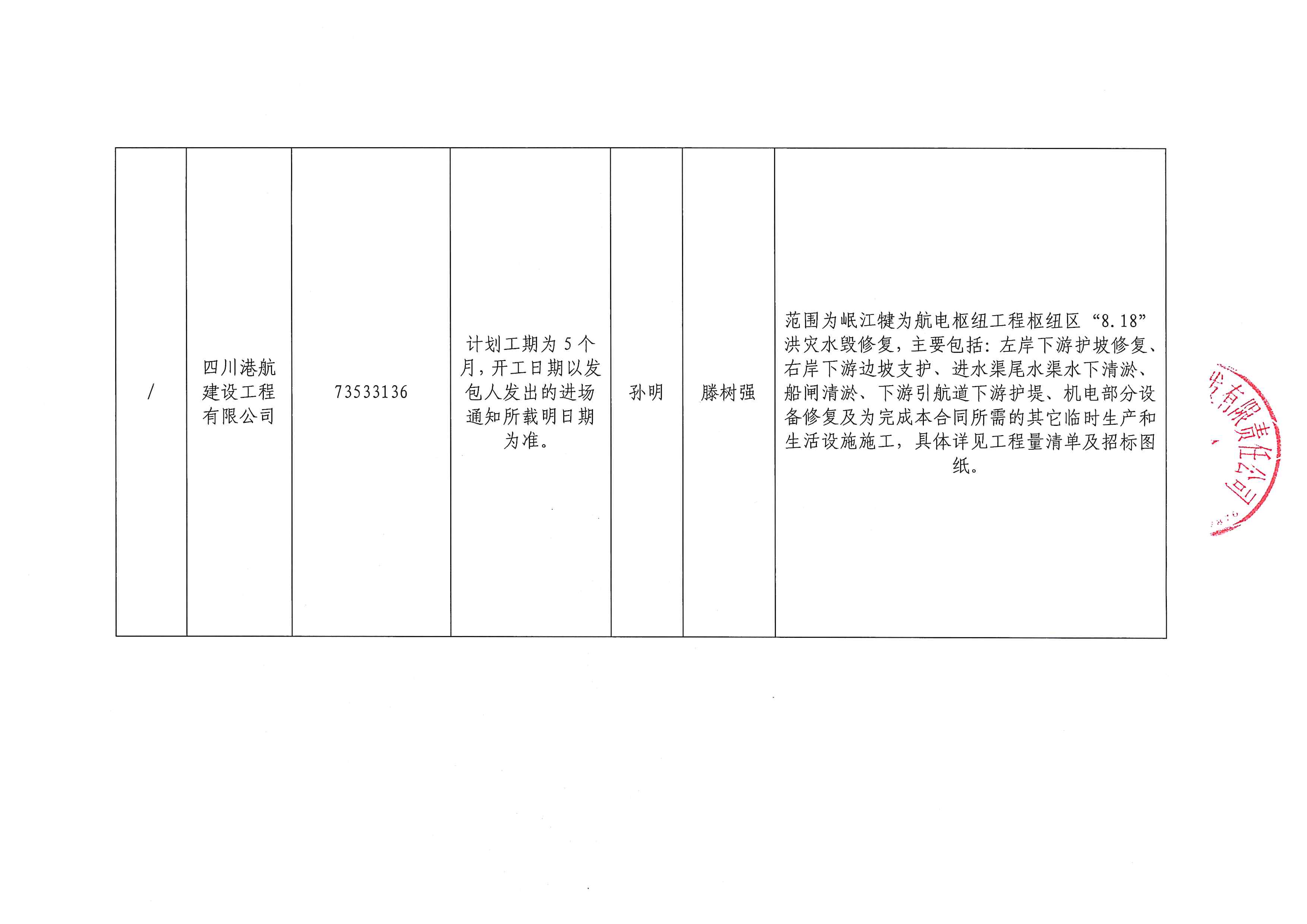 岷江犍为航电枢纽工程营地5#楼改造、“8.18”洪灾水毁修复等项目合同主要信息公告