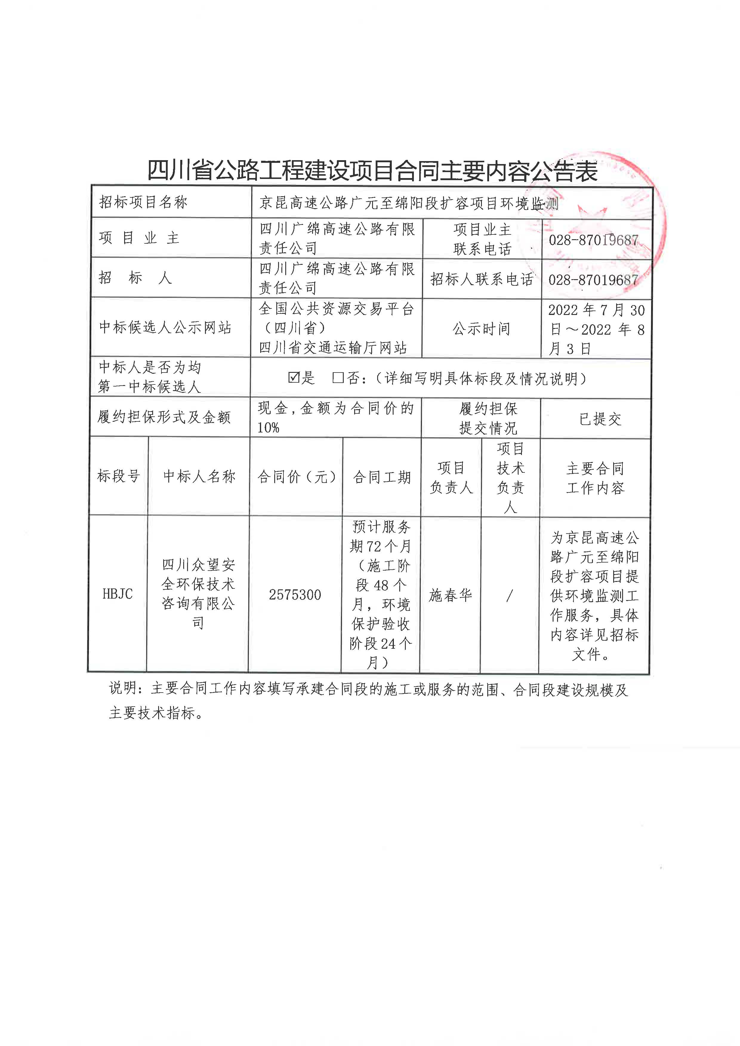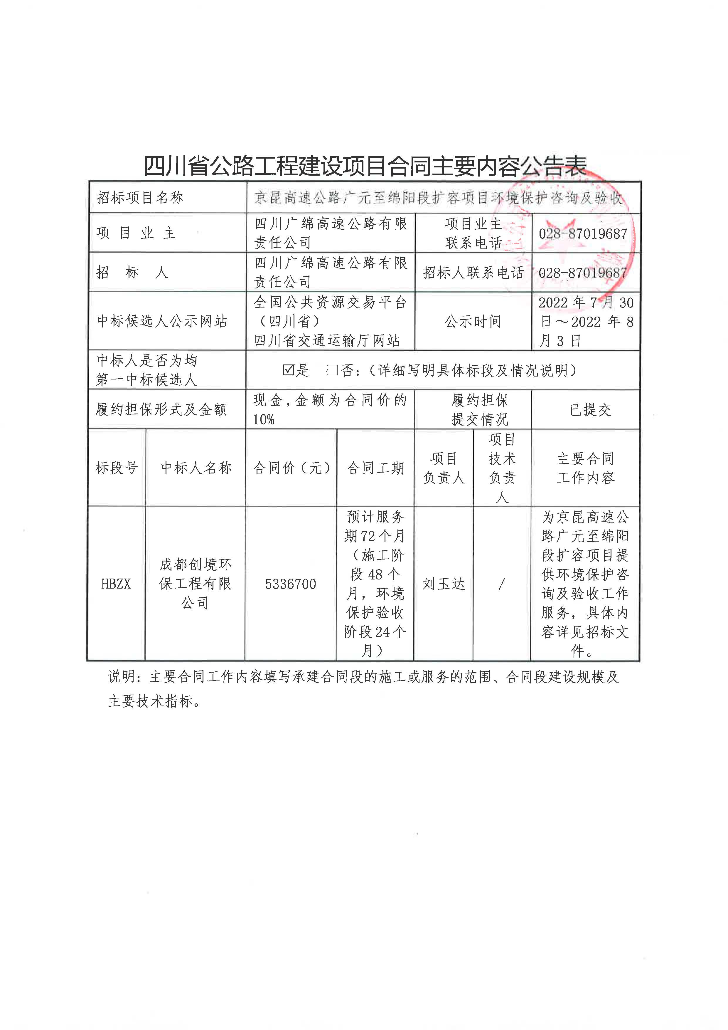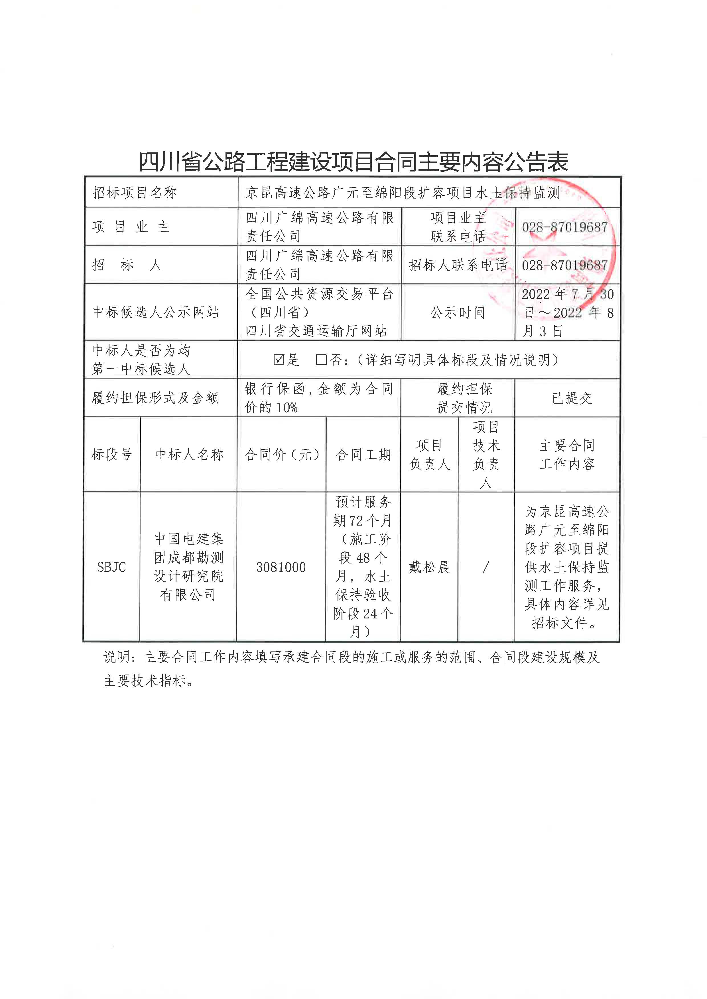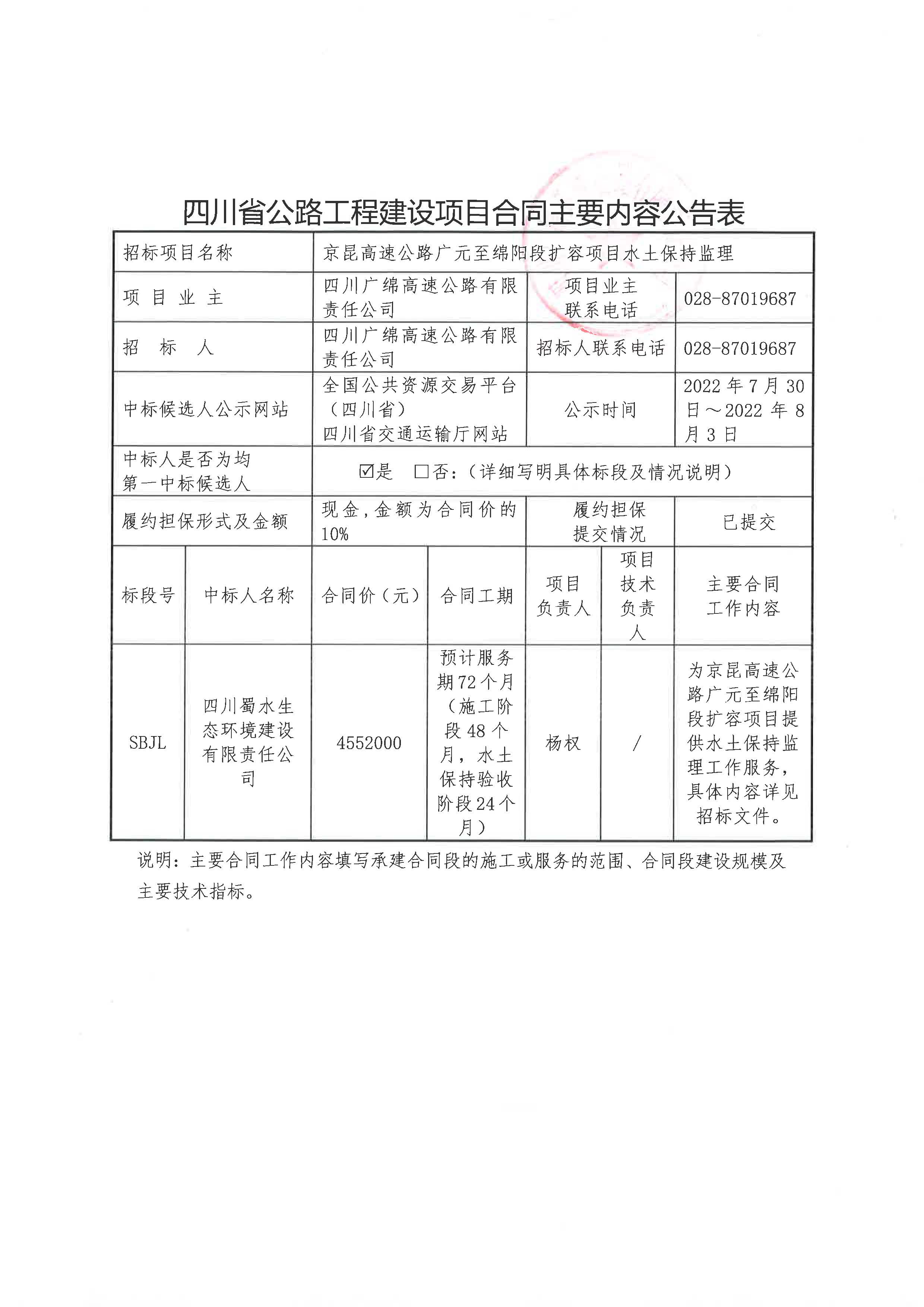 京昆高速广元至绵阳段扩容项目环水保监理、监测合同主要内容公告
