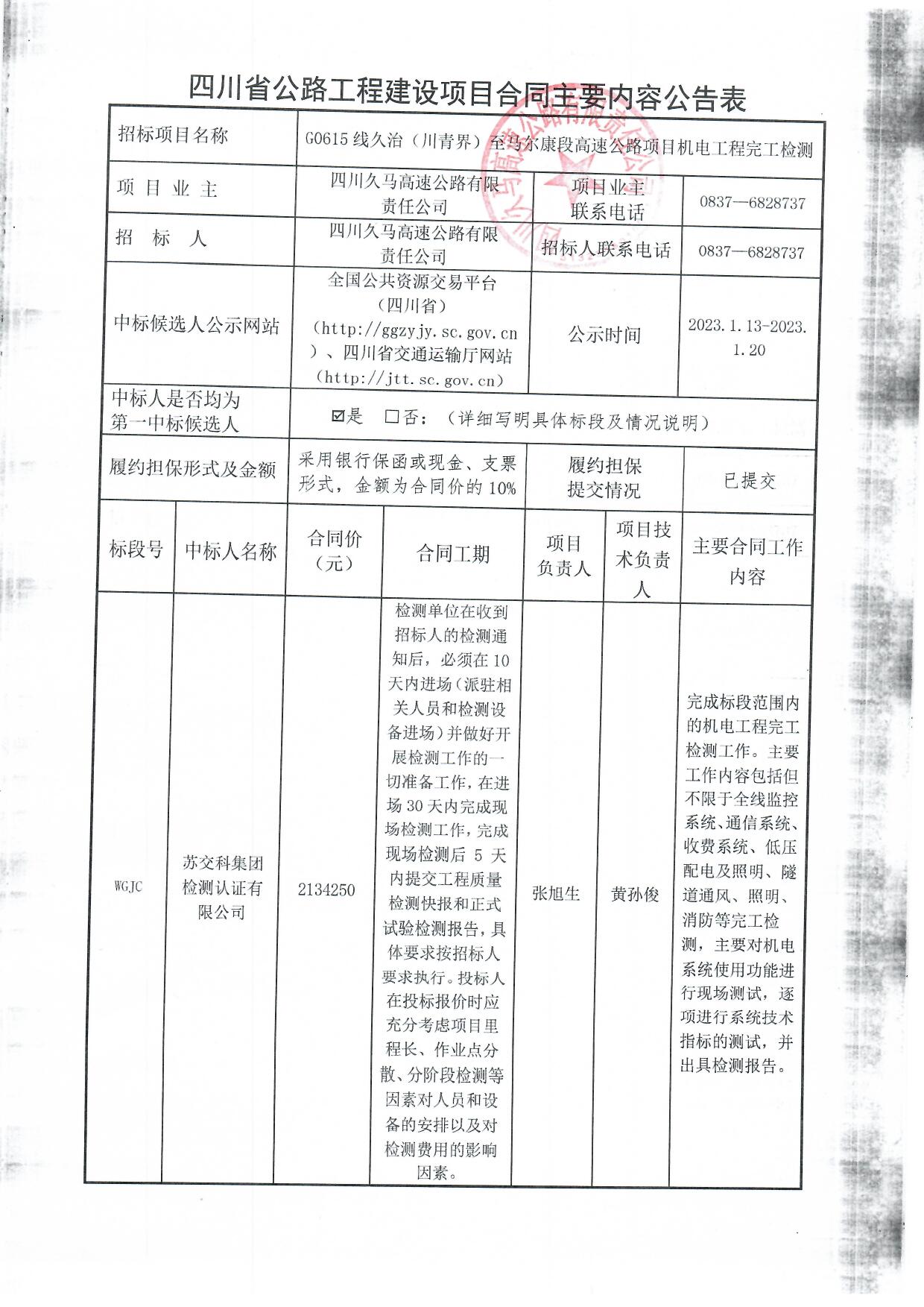 G0615久治至马尔康段高速公路机电工程完工检测合同主要内容公告