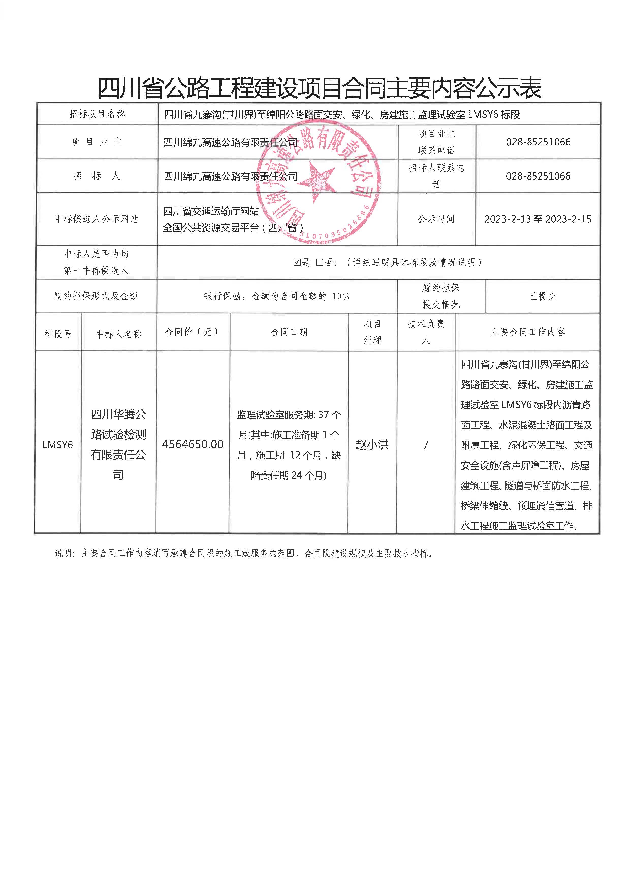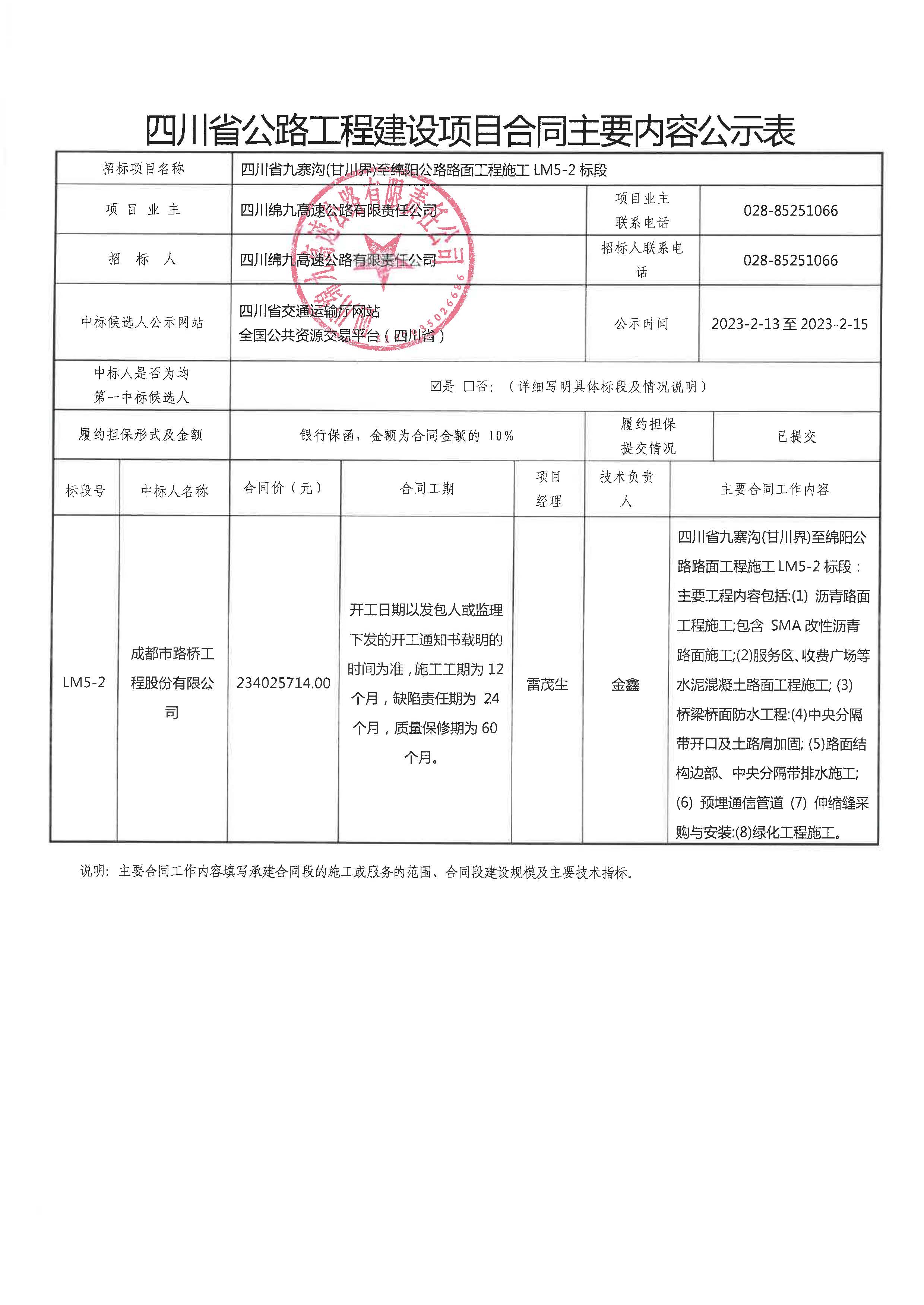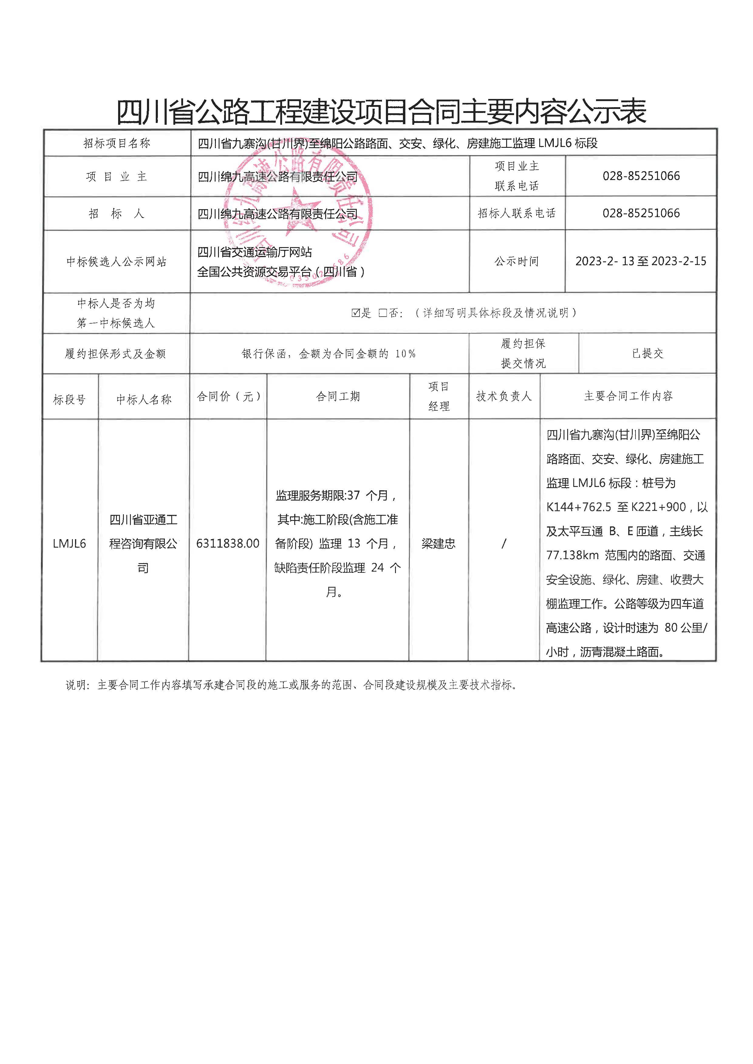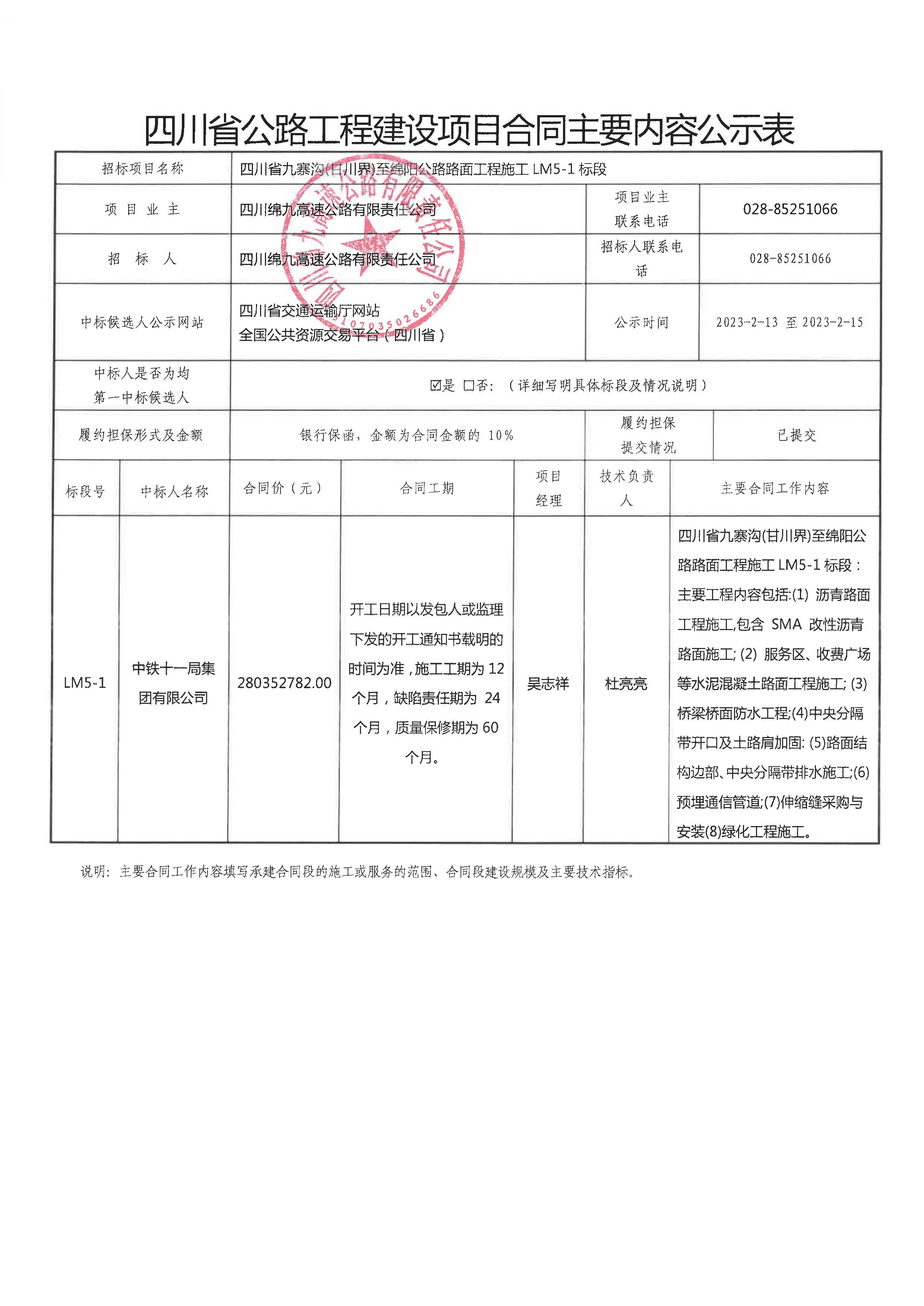 九寨沟至绵阳高速公路路面施工LM5-1、LM5-2及路面施工监理LMJL6和监理试验室LMSY6标段合同主要内容公告