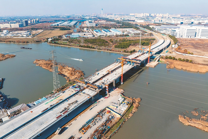 1月23日,寒潮来临,昆山振新路吴淞江大桥建设施工单位,在认真落实安全生产和防寒保暖措施后,加紧施工建设。大桥建成后将成为贯穿昆山市东西向的一条交通主干道,缓解周边道路的交通压力,预计将于今年7月建成通车。 张从余 摄 (视觉江苏网供图)