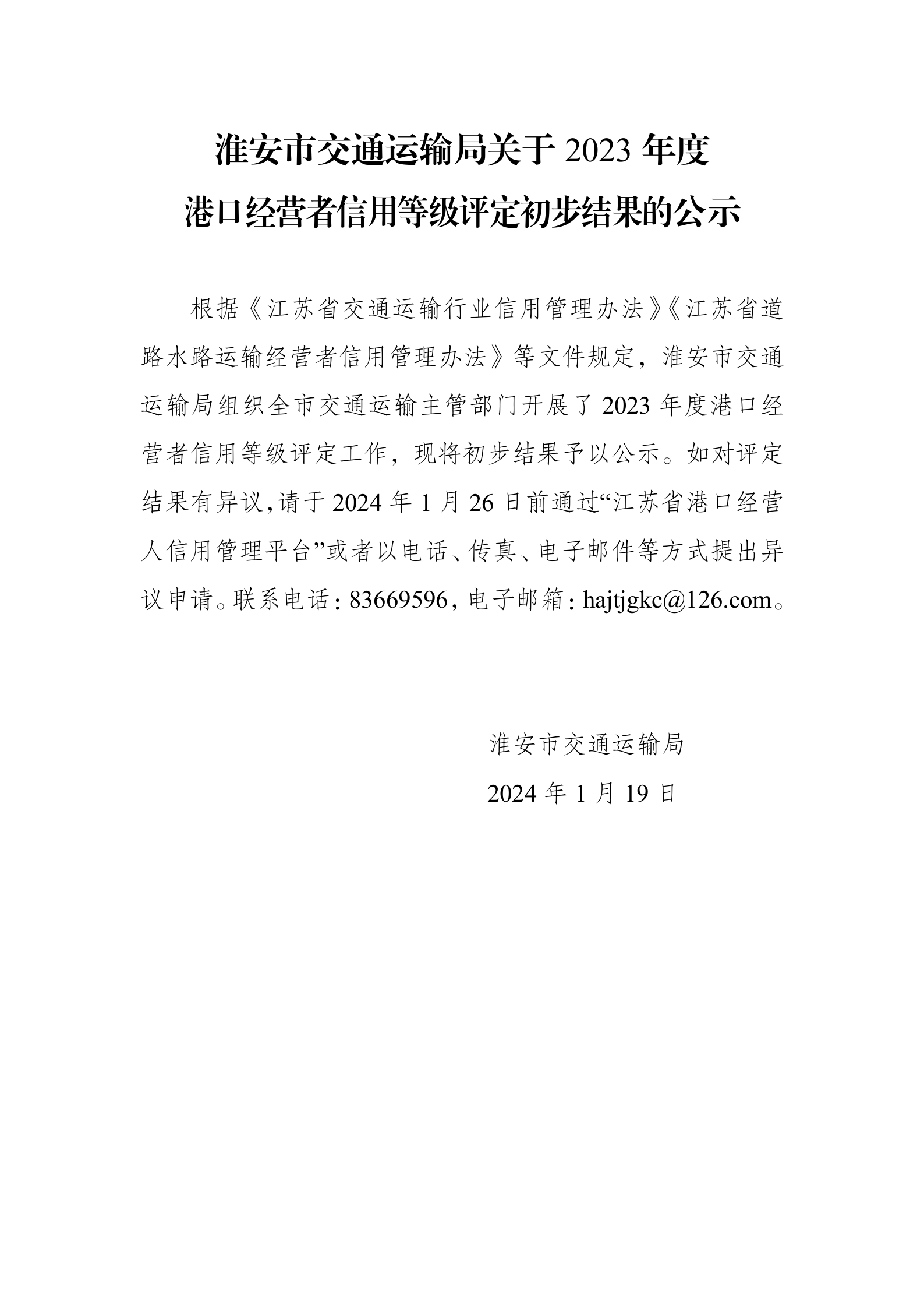 淮安市交通运输局关于2023年度淮安市港口经营者信用等级评定初步结果的公示