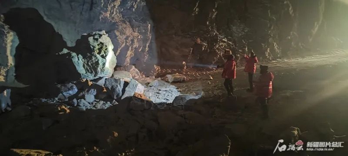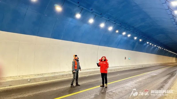 阿合奇公路分局技术员在阿特约勒隧道内查看震后隐患。金美华 摄