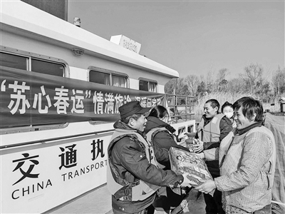 图为春节期间,宿迁航务中心宿迁船闸深入开展“苏心春运”主题活动,向过往船员送祝福、送礼包、送安全、送服务。陈飞 摄