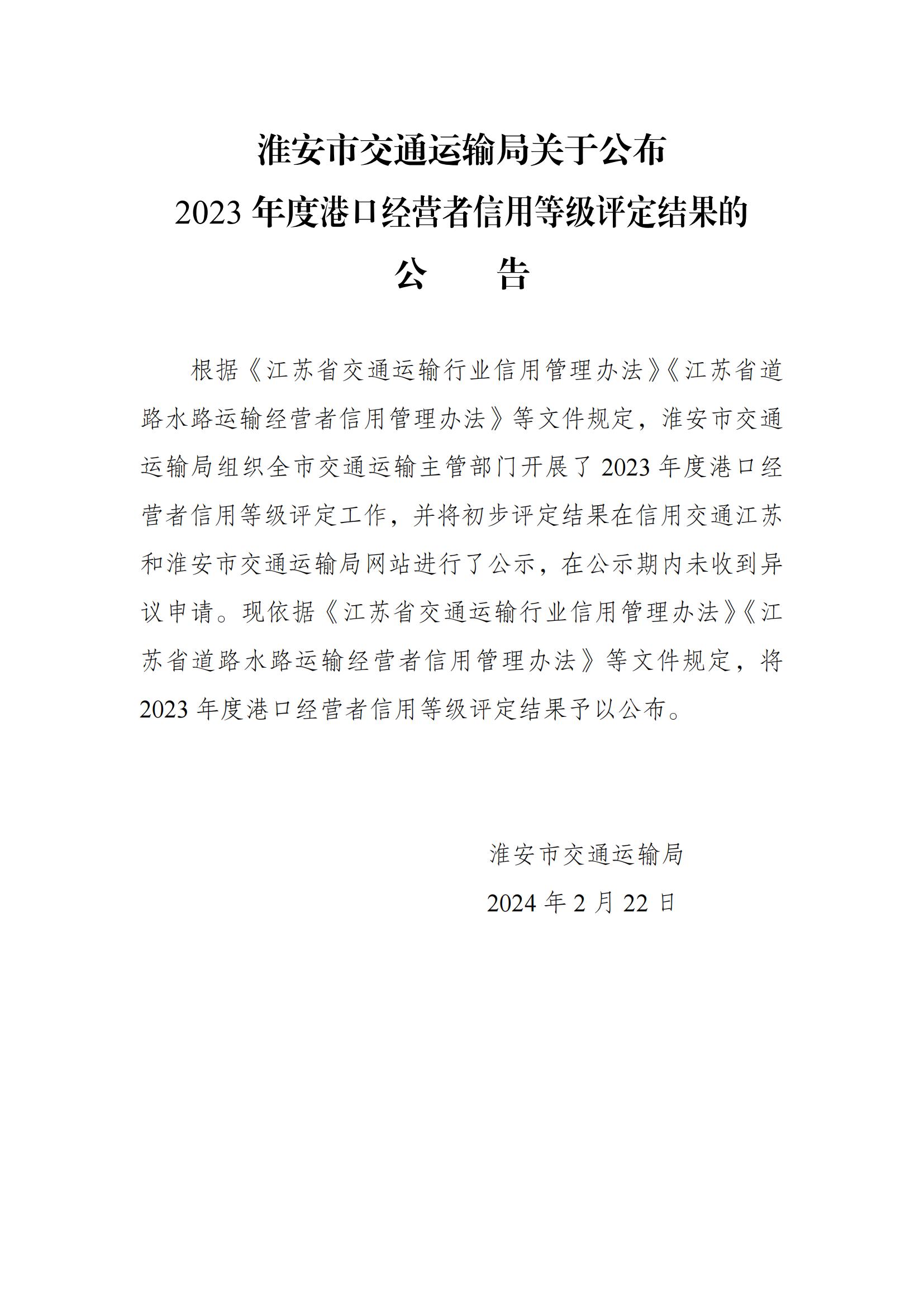 淮安市交通运输局关于公布2023年度港口经营者信用等级评定结果的公告