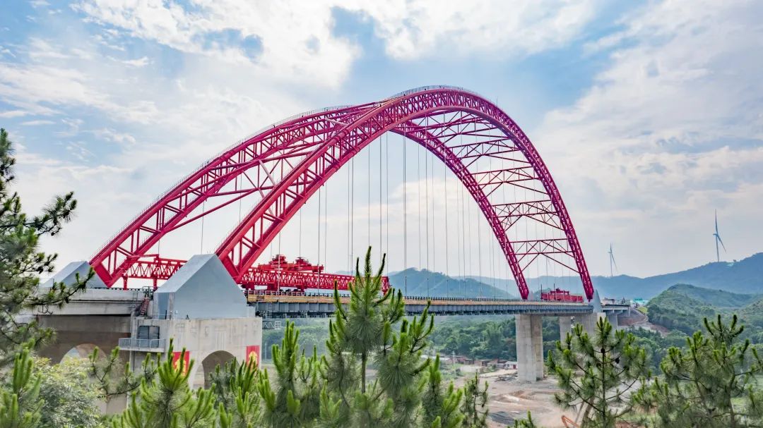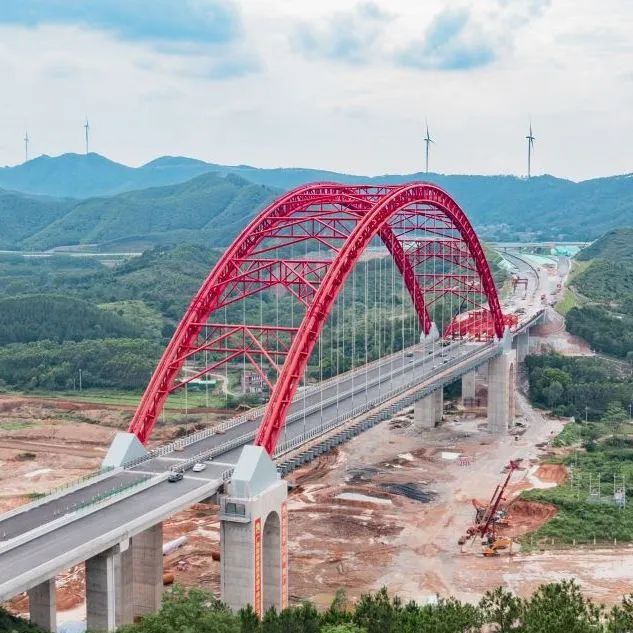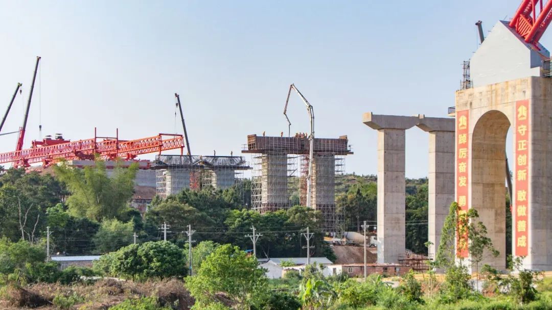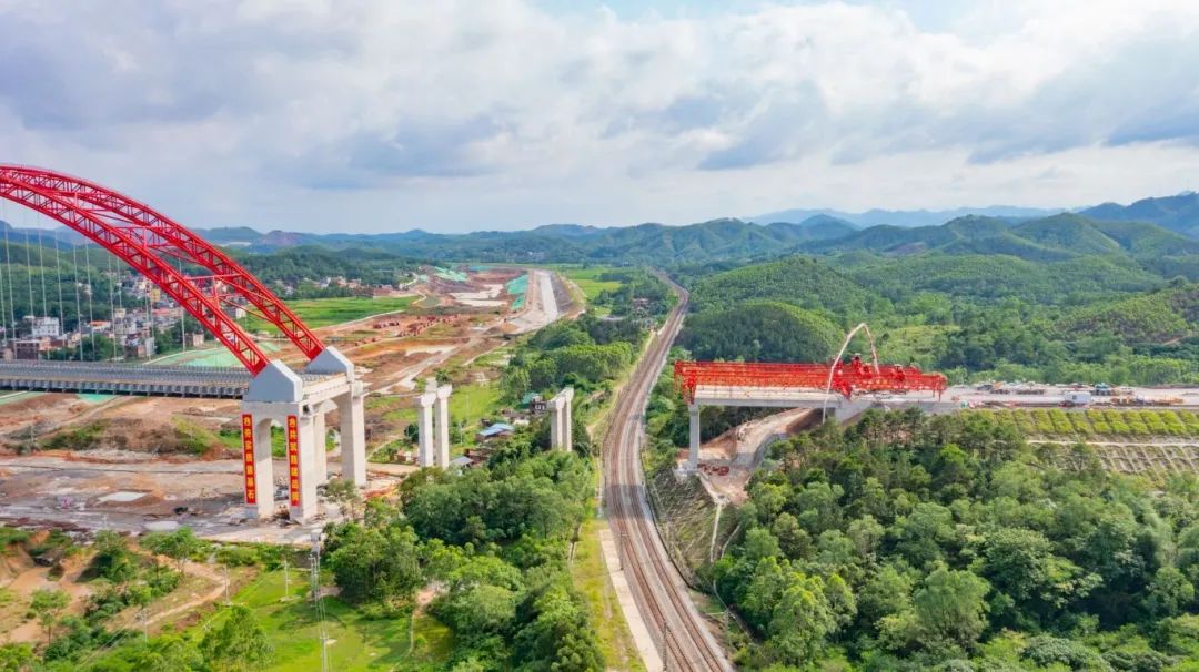 平陆运河旧州特大桥是南湛高速重点控制性工程之一,由广西北部湾投资集团直属企业广西新发展交通集团投资、广西路建工程集团承建。主桥横跨平陆运河,引桥跨越黎塘至钦州铁路。该桥全长约525米,主桥为跨径260米的下承式钢管混凝土系杆拱桥,采用“低位拼装+中段拱肋门架法”整体提升施工工艺,整体提升节段长202米,提升重量约1800吨,是目前世界最大拱肋整体提升跨径和吨位的钢管混凝土拱桥。