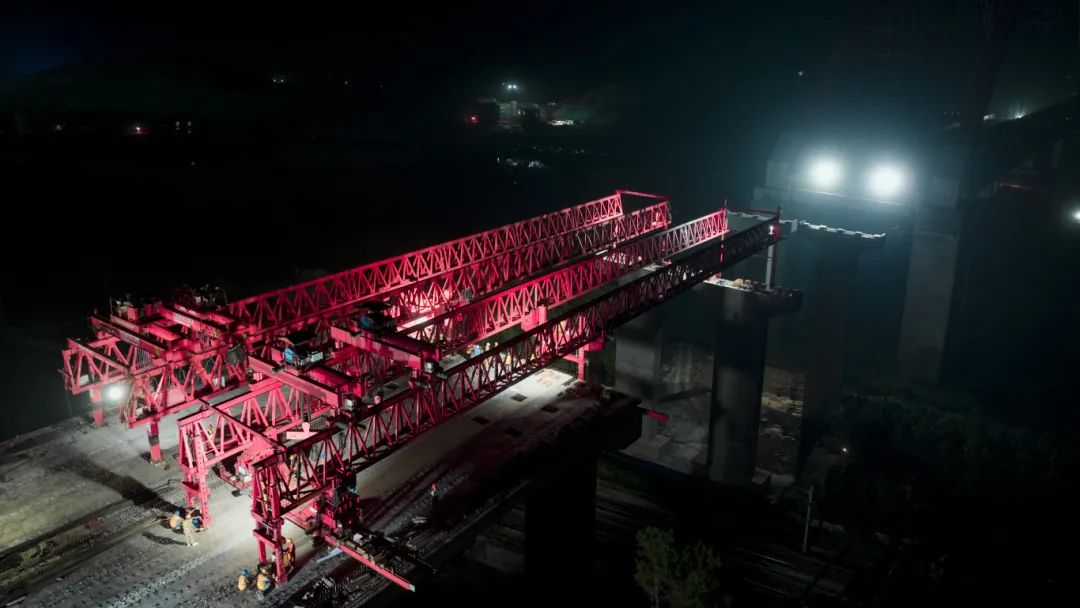 平陆运河旧州特大桥涉铁引桥凌晨时段施工现场。