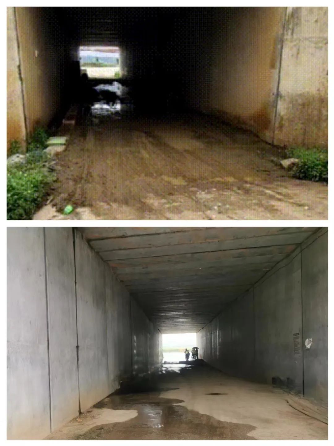S31三南高速高仁隧道附近涵洞修复前(上)后(下)。