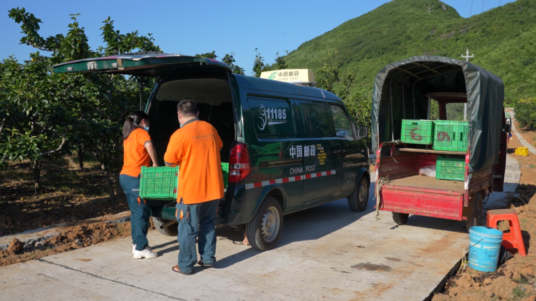 贺州市邮政快递车到果园提供上门取件服务。(毛俊人 摄)