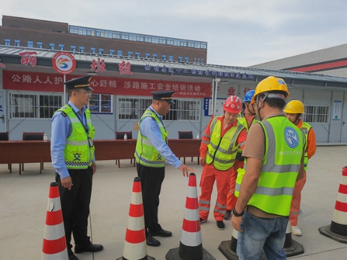 省交通综合执法局徐盐支队第四大队走进辖区重点涉路施工项目睢宁西互通枢纽改造工程项目部,举办涉路施工人员安全教育培训讲座,重点解读《江苏省公路施工路段管理办法》,就如何强化涉路施工现场秩序、规避施工安全风险,以及意外事故应急处置等方面进行指导培训。活动现场,大队执法队员联合养护部门在涉路施工中就规范设置施工标志、安全标志与施工单位进行模拟演练,进一步提升涉路施工人员安全风险防范意识和应对突发情况应急处置能力。