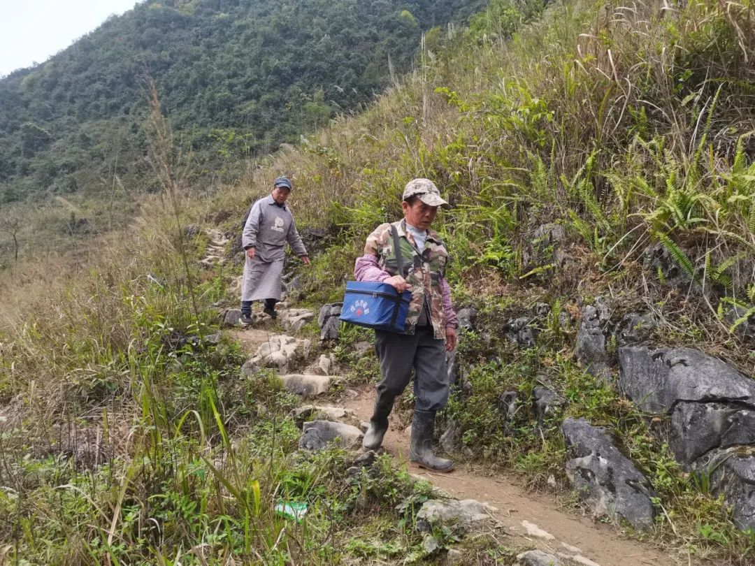 行路难,是蒙秀金40年前面临的最大工作难题。古朝村村委会共管辖30多个自然屯,相互靠着各种弯曲的山路连通。在那个完全“靠腿”的年代,无论刮风下雨,蒙秀金都只能背着药箱、迈着双腿,穿梭在狭窄崎岖的山路上,他的足迹遍布古朝村四里八乡的深山大弄,鞋子磨烂了一双又一双。
