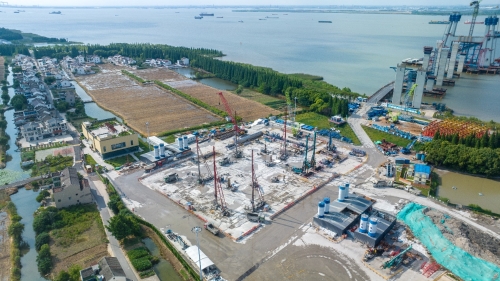 张靖皋长江大桥南航道桥为主跨2300米悬索桥,锚碇施工是大桥的关键控制性工程。南锚碇地基加固采用超深、大断面、超高压旋喷咬合桩施工工艺,加固深度直达地下70米,旋喷桩桩长18米,桩径2.2米,桩数多达1471根,加固面积约8300平方米,旋喷桩施工垂直度需控制在1/300以内,施工工程量大、技术难度高。
