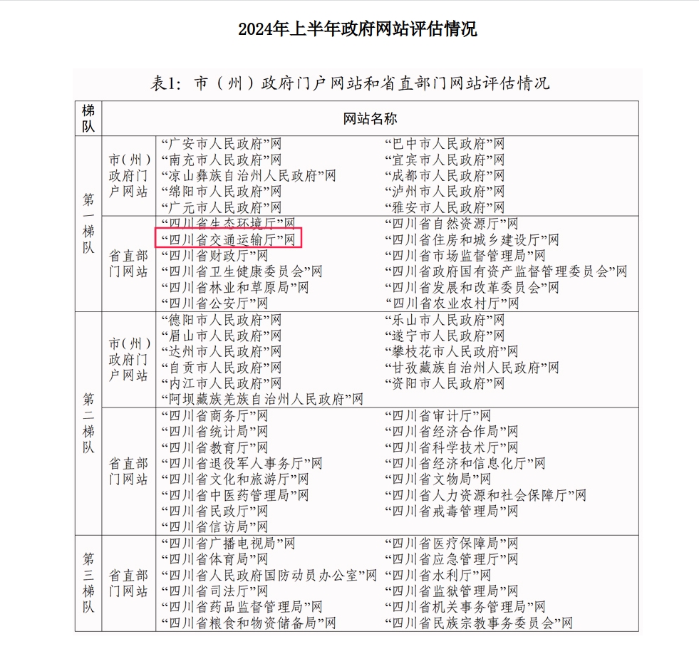 近日,四川省人民政府办公厅通报了2024年上半年政府网站与政务新媒体检查暨监管工作年度考核情况,“四川省交通运输厅”网站在2024年上半年政府网站评估中位列省直部门网站第一梯队。