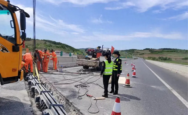 9:33,金州执法大队执法人员在伊开高速公路安恕方向检查更换桥梁伸缩缝施工现场,副队长李朋飞现场查看了施工应急方案,检查了安全保护装备,施工现场符合《高速公路作业流程》作业规范。执法人员督促施工负责人,一定要严格按照高速公路作业流程进行安全施工,管理好现场人员,遇有突发事件,要第一时间上报,确保安全施工,高速公路通行正常。