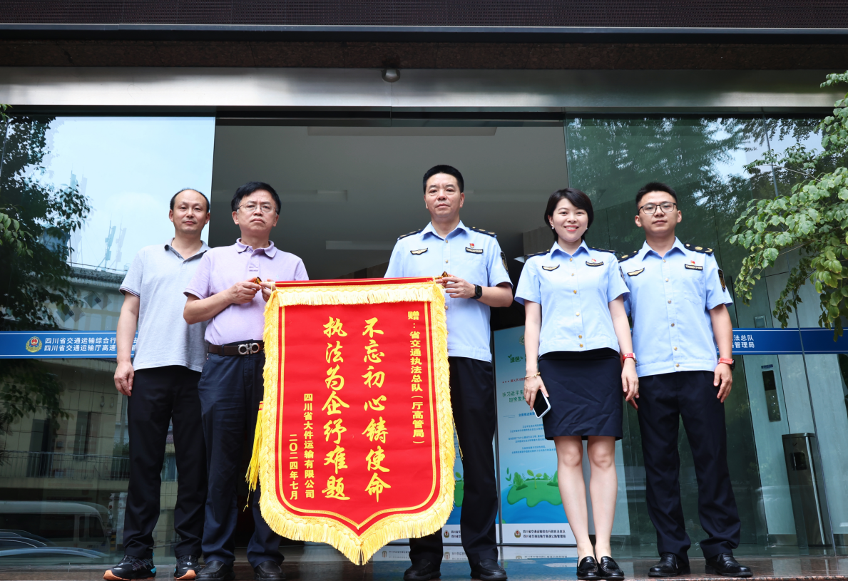 为确保川渝特高压“天府南站”工程项目大件运输车辆顺利通行,省交通执法总队(厅高管局)主动担当作为,积极协调“一路三方”保障其安全通行高速公路,用实际行动助力国家重点项目建设,为经济社会高质量发展贡献“高速”力量。7月16日,四川省大件运输有限公司代表赠送印有“不忘初心使命,执法为企纾难题”的锦旗,感谢总队(局)为企业解决运输实际困难,高度赞扬执法人员在工作中彰显的职业操守和专业风范。下一步,总队(局)将始终践行执法为民(企)的服务理念,做到执法有力度、服务有温度,不断提升社会认可度和群众满意度。【省交通执法总队(厅高管局)】