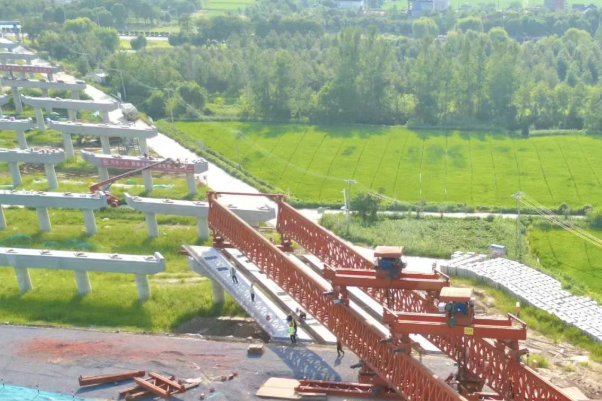 8月20日,宁盐高速公路扬州段NY-YZ5标湖西互通主线桥首片预制箱梁完成架设。