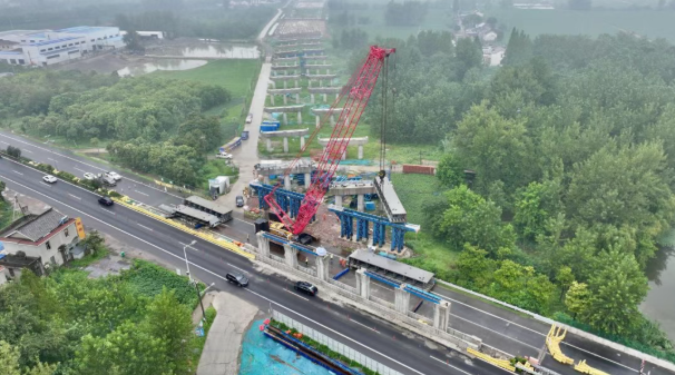 8月13日,宁盐高速扬州段高邮城南新区互通主线桥首节钢箱梁顺利安装。