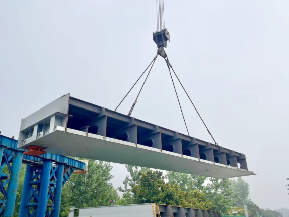 高邮城南新区互通上跨233国道主线桥钢箱梁共48节,本次安装的首节钢箱梁位于10号墩与12号墩之间,采用单箱三室截面结构,长19.5米、重约28吨,安装高度7.5米,由350吨履带吊完成吊装作业。施工过程中,建设团队严格执行施工方案和操作规程,精细控制起吊、运输、定位等关键环节,科学实施交通导改,优化组织工序、统筹资源配置,确保施工进度与工程质量,预计10月底将完成该互通钢箱梁施工。