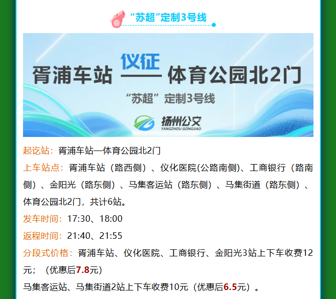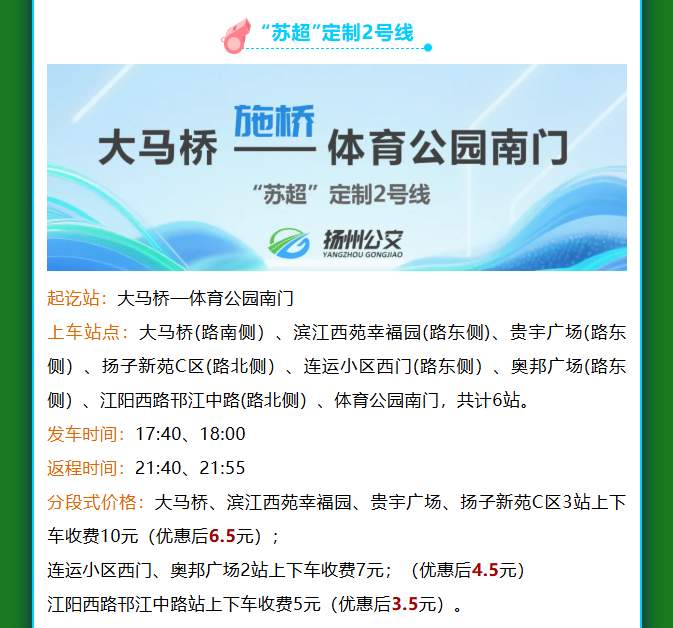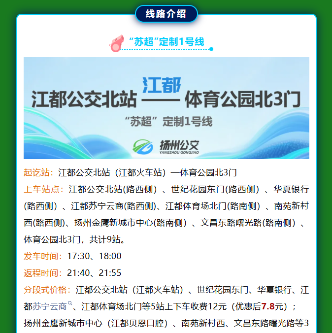 8月12日,扬州公交集团正式发布三条“‘苏超’定制公交专线”服务方案,为本周日“苏超”扬州主场比赛提供专项出行保障。