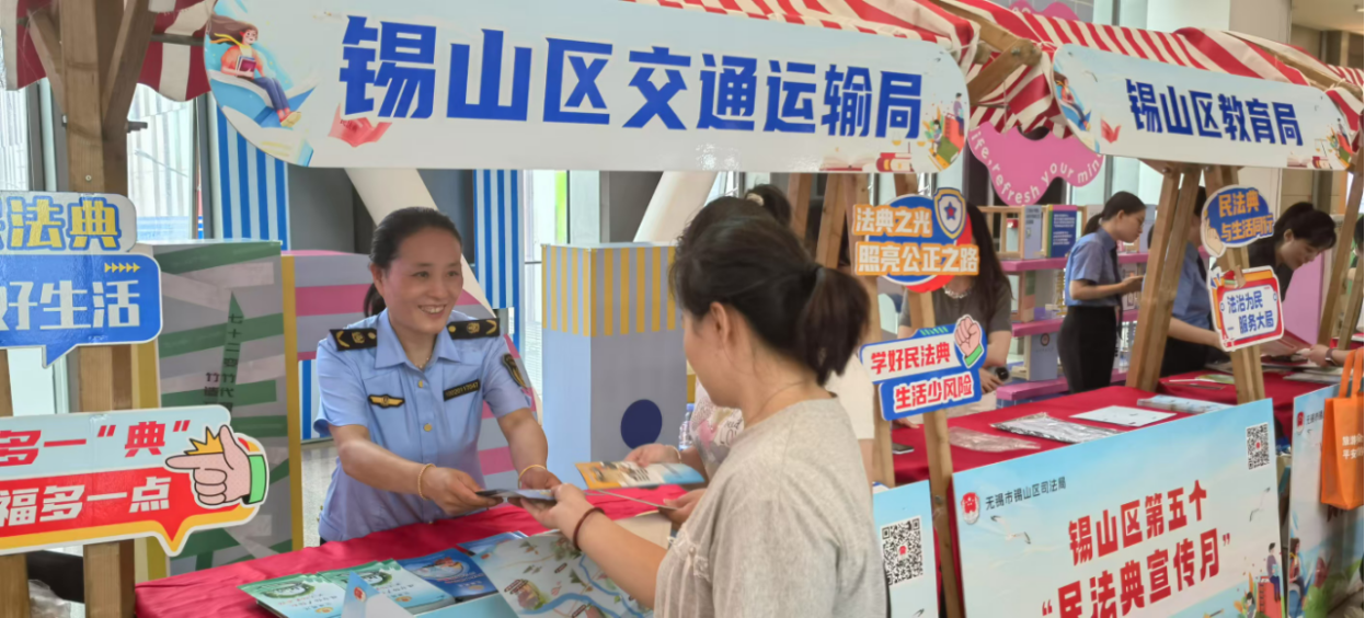 锡山交通在荟聚中心参加普法游园会,普法志愿者化身“摊主”,通过摆放展板、发放资料等方式,用通俗语言讲解《中华人民共和国民法典》知识,耐心解答群众法律咨询,同时在重点路段营造普法氛围,让“法典之光”照亮群众日常生活。