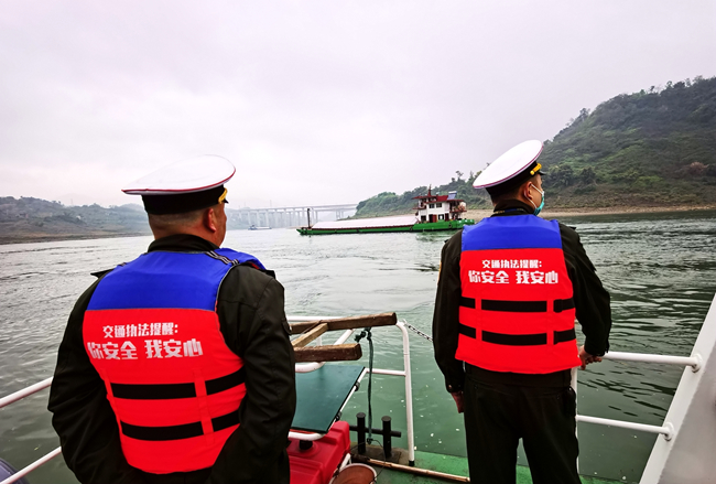 当集装箱运输船队抵达草街水域时,港航海事支队执法队员实施登船检查,做到船舶适航、船员适任,消除船舶安全隐患,增加船员安全操作和应变能力。并且视嘉陵江水情、流量情况适时开展护航,测量险滩水深尺度,驱离航道碍航活动者,暂停过往车客渡船及水工作业船舶,全力保障广元至重庆集装箱班轮运输船队安全过境嘉陵江重庆段。(港航海事支队 李月宇 文/图)